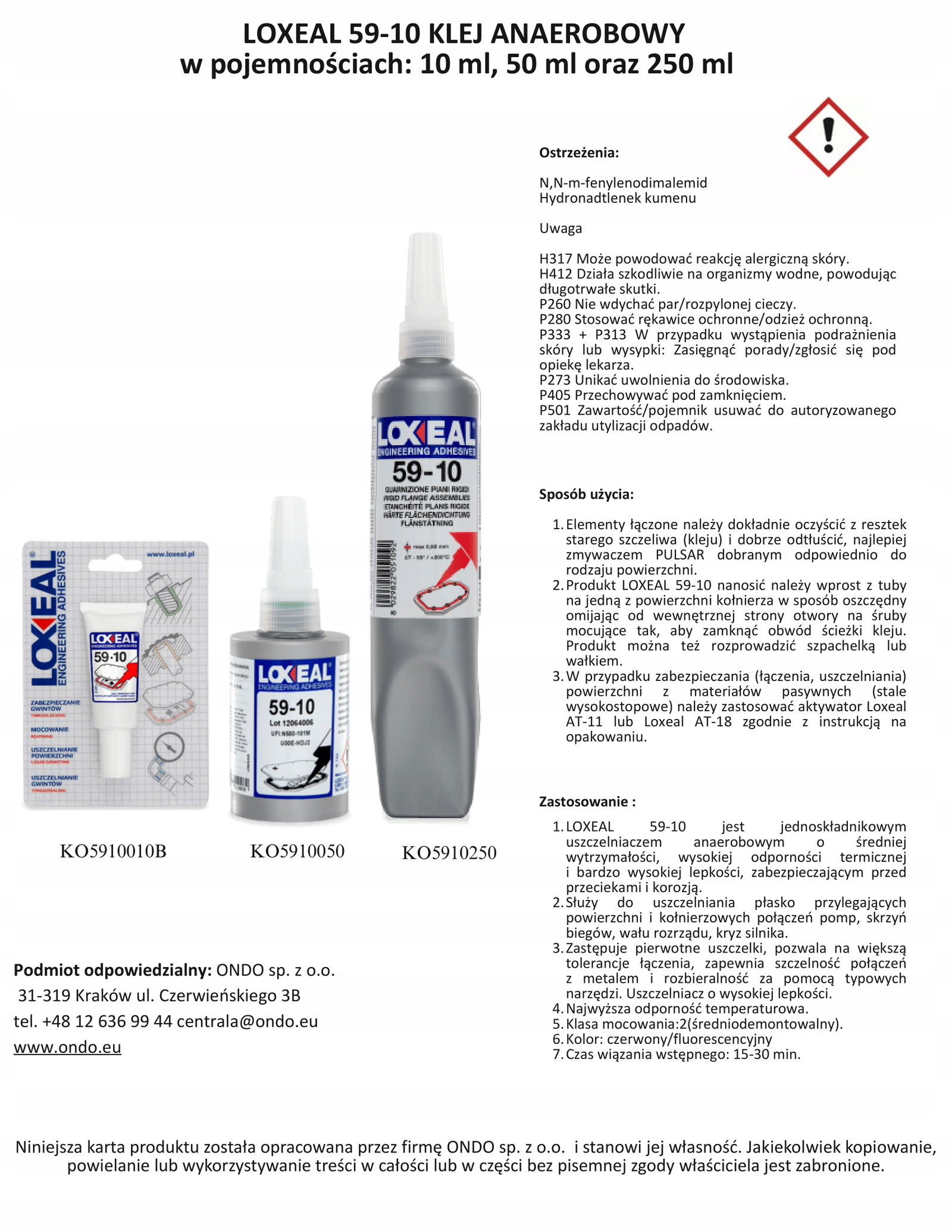 ✅ LOXEAL 59-10 jest jednoskładnikowym uszczelniaczem anaerobowym o średniej wytrzymałości, wysokiej odporności termicznej i bardzo wysokiej lepkości, zabezpieczającym przed przeciekami i korozją. Utwardzanie produktu następuje po odcięciu dopływu powietrza (tlenu) w szczelinie pomiędzy dwoma metalowymi powierzchniami.