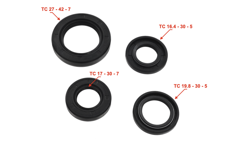 Zestaw uszczelniaczy silnika do skuter 4T. Rozmiary A.27/42/7 B.17/30/7 C.19.8/5/31 D. 16.4/30/5