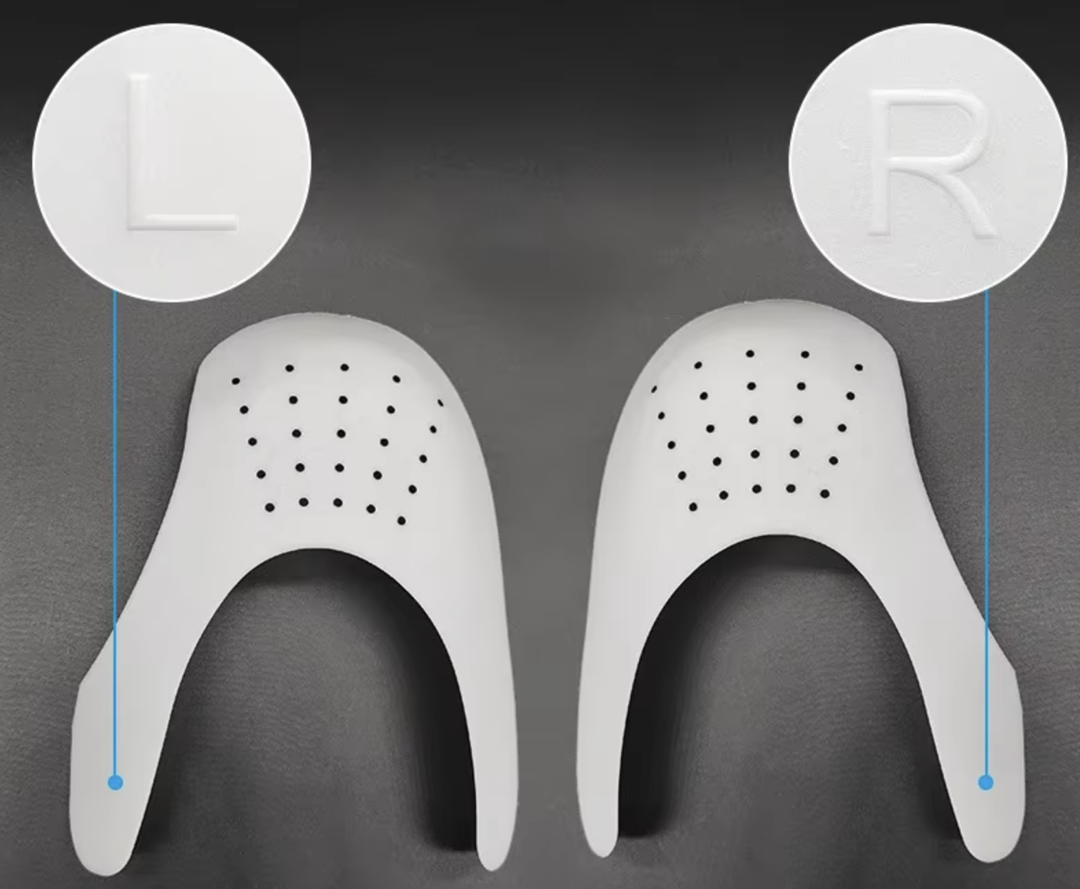 Usztywniacz możesz dowolnie przyciąć wzdłuż zaznaczonych linii, dzięki temu z łatwością dopasujemy go do indywidualnych potrzeb. Usztywniacz posiada oznaczenia L (lewy) i R (prawy), co pozwala na dobre dopasowanie usztywniacza do konkretnego obuwia.
