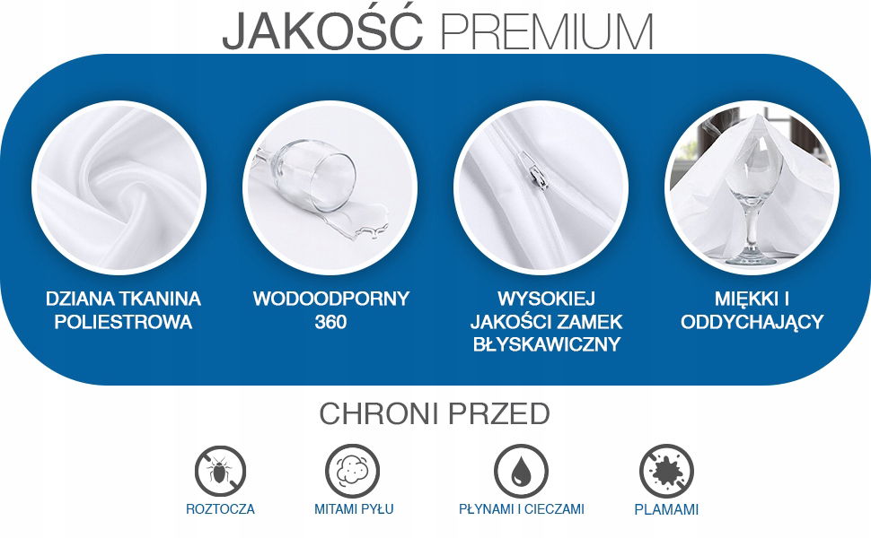Nasze ochraniacze na poduszki są wyposażone w wysokiej jakości zamek błyskawiczny, który zapewnia ochronę poduszki ze wszystkich stron przed pluskwami i roztoczami