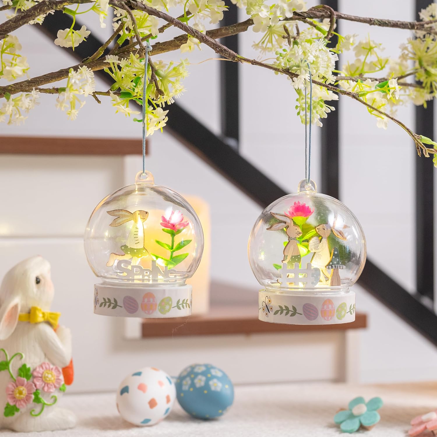 Opis Produktu: Zapraszamy do zapoznania się z naszą wielkanocną dekoracją drewnianą marki Valery Madelyn. Ten zestaw zawiera dwie dekoracje w kształcie wielkanocnego zająca, każda z nich wyposażona w oświetlenie LED i szklaną pokrywę.