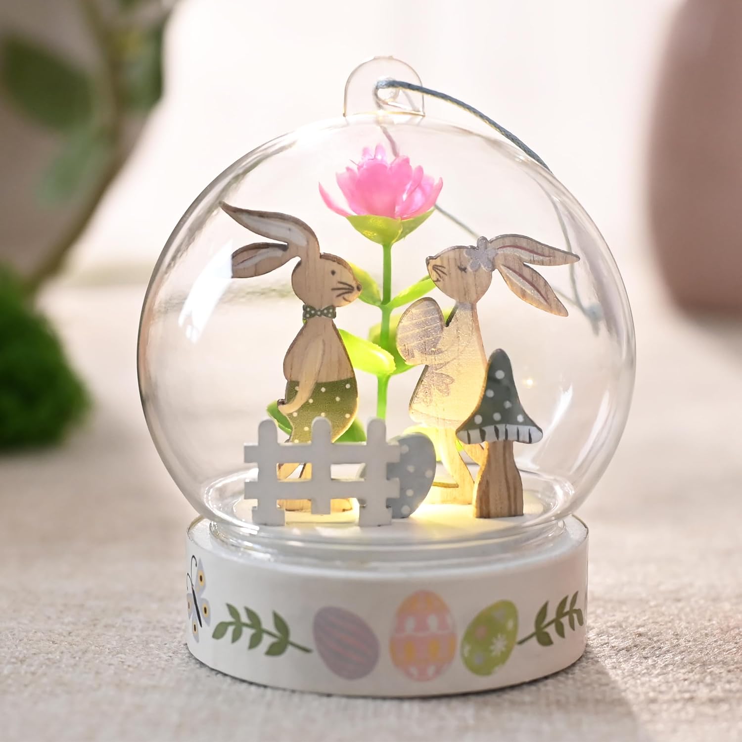 Cechy Produktu: Nasza dekoracja wielkanocna jest wykonana z drewna i ręcznie malowana, co gwarantuje jej unikalny i autentyczny wygląd. Po włączeniu, ciepłe światło LED tworzy przytulną i ciepłą atmosferę w Twoim domu. Dekoracja jest rzeźbiona i montowana z wykwintnym rzemiosłem, co podkreśla jej jakość premium.