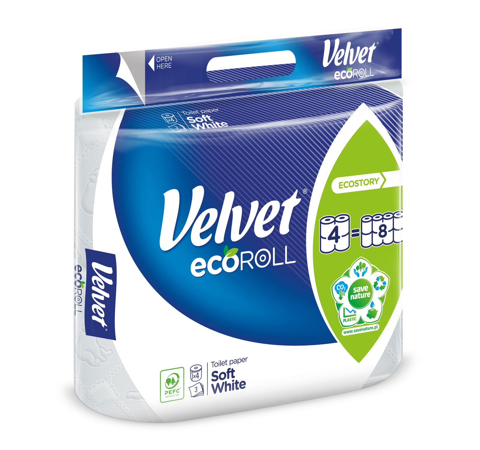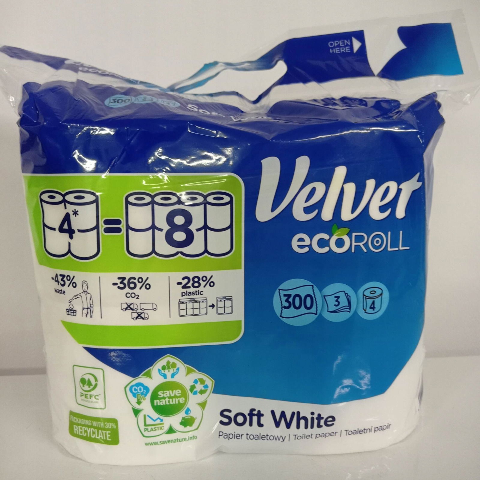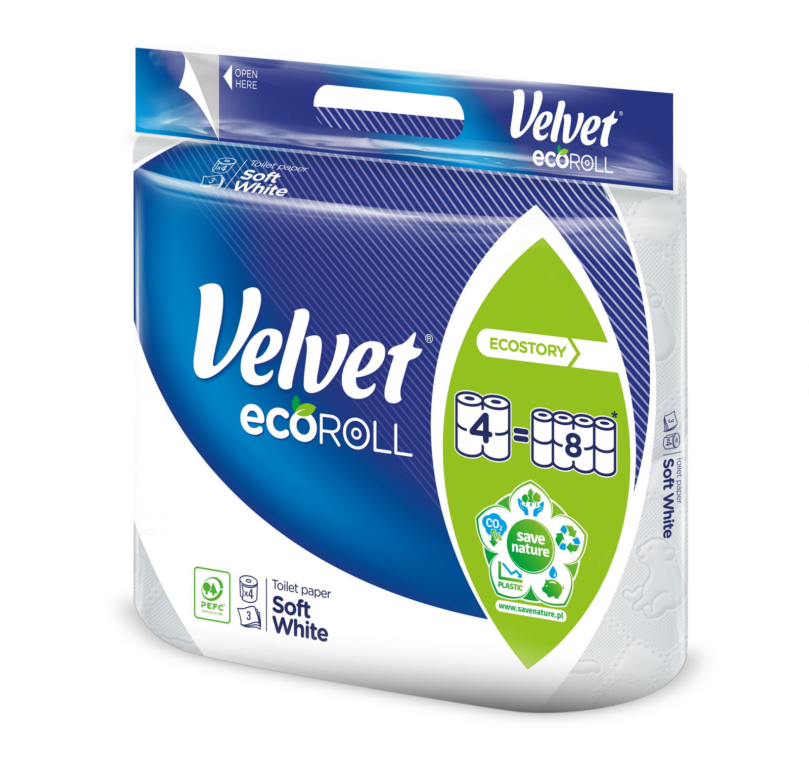 Papier stworzono z myślą o naturze, dlatego cztery podwójnie długie rolki – ecoROLL zastępują osiem zwykłych rolek papieru. Dzięki czemu do spakowania ecoROLL wykorzystano mniej plastiku, a to prowadzi do ograniczenia produkowanych odpadów. Ponadto produkt zajmuje mniej miejsca w transporcie, co wiążę się z mniejszą ilością ciężarówek do przewozu produktów i tym samym redukcją wytwarzanych spalin do powietrza.
