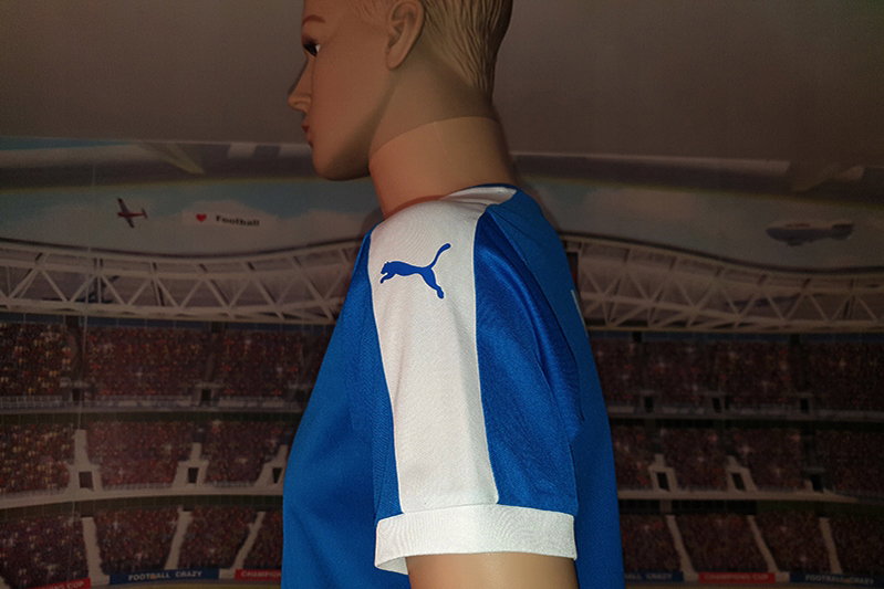 Koszulka posiada krótkie rękawki i dominuje w niej kolor niebieski wraz z biało – pomarańczowo – srebrnymi dodatkami” zaś kołnierzyk tego piłkarskiego trykotu jest wykonany w stójkę.