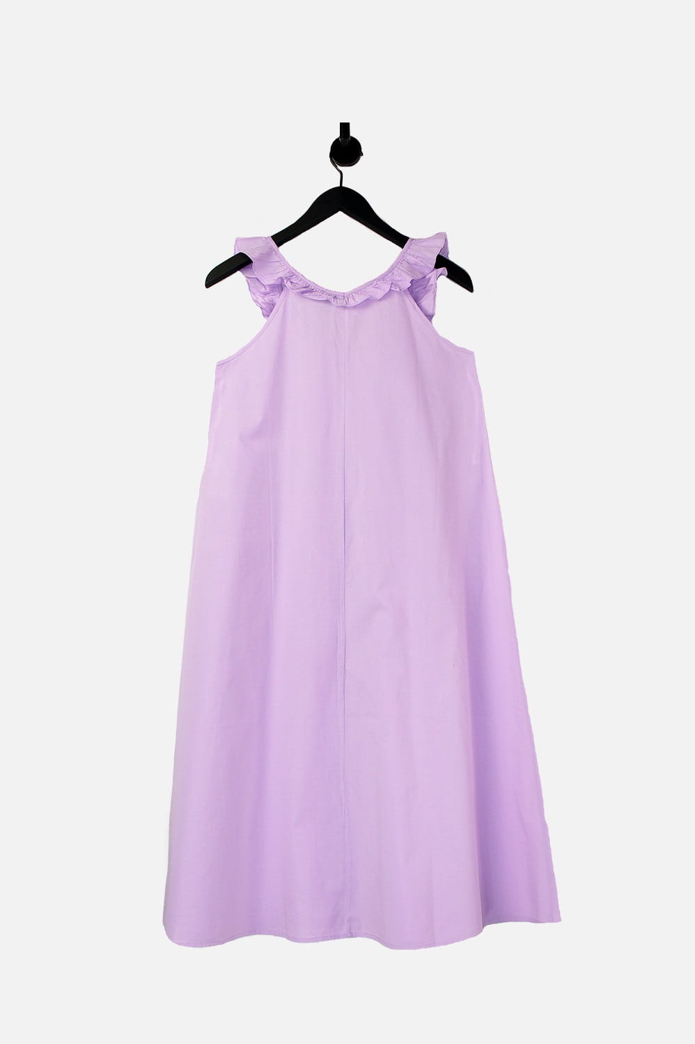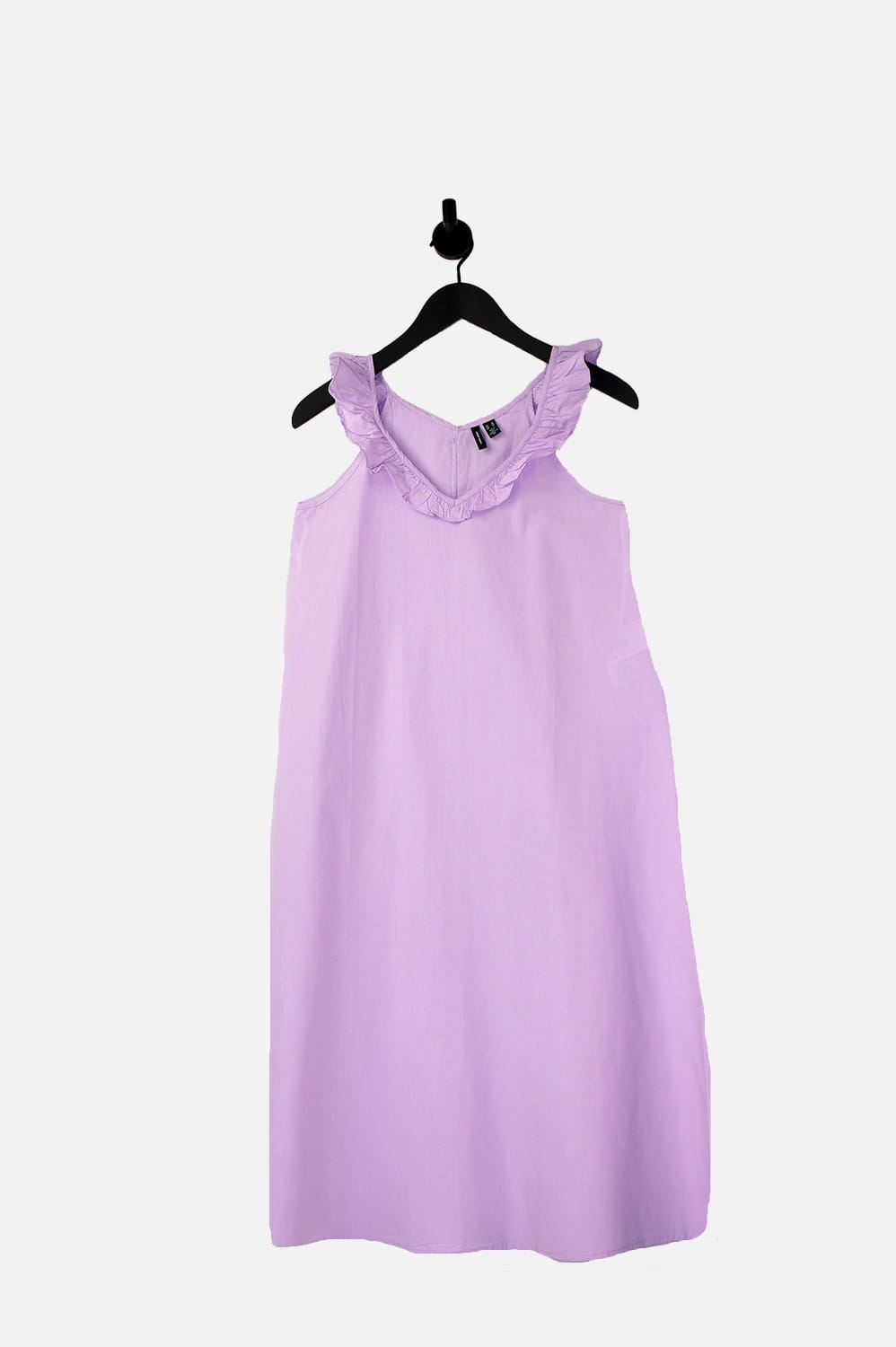 Ta urocza sukienka w kolorze liliowym to esencja kobiecego uroku. Posiada falbankę przy dekolcie, która dodaje subtelności całości. Dekolt typu serek lub V pięknie podkreśla szyję, a brak rękawów sprawia, że jest idealna na ciepłe dni.