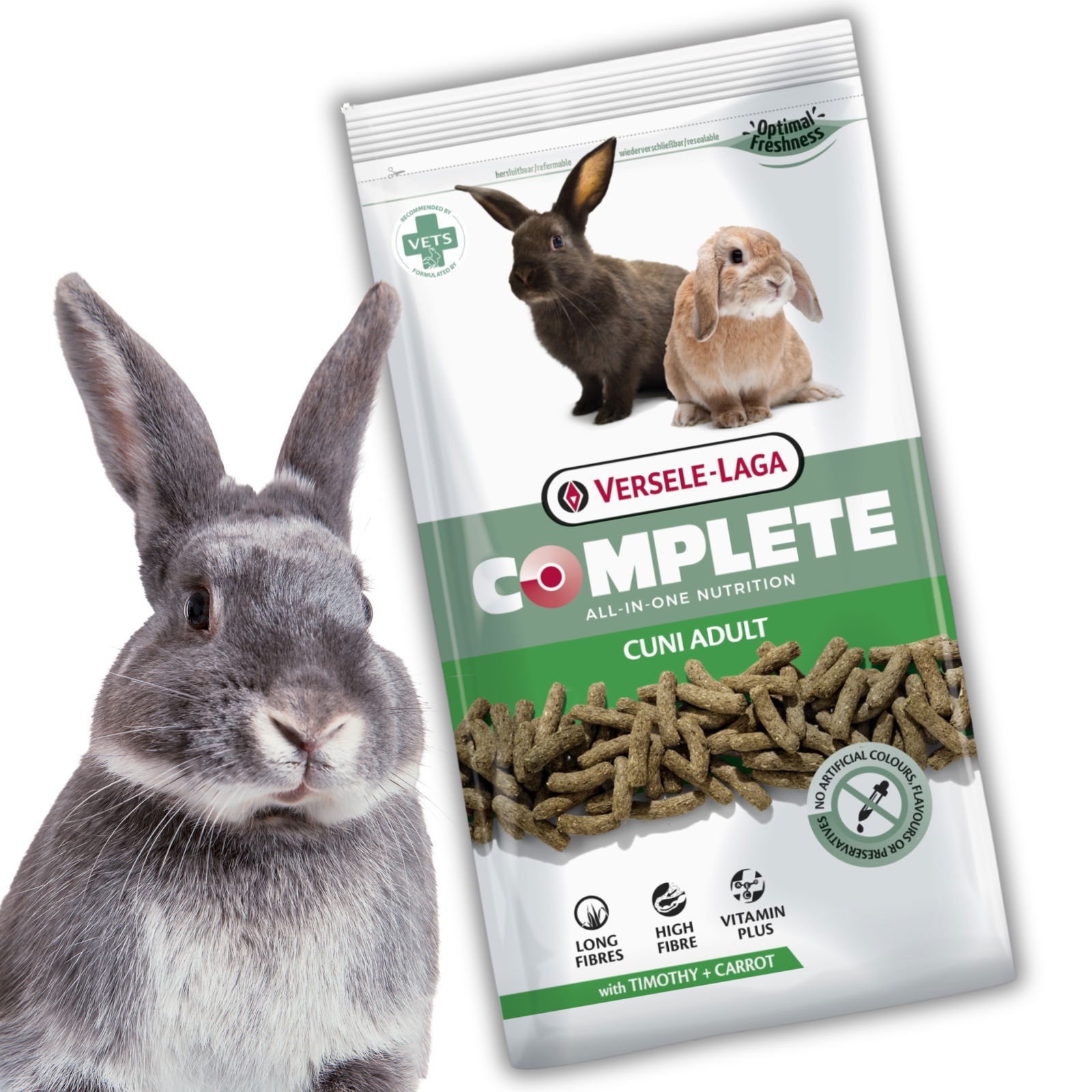 Karma dla dorosłych królików Versele-Laga Cuni Adult Complete to kompletna, ekstrudowana karma typu „wszystko w jednym”, przeznaczona dla dorosłych królików, w tym królików miniaturowych. Każdy granulat zawiera pełen zestaw składników odżywczych, dzięki czemu zapobiega wybiórczemu jedzeniu i niedoborom pokarmowym.