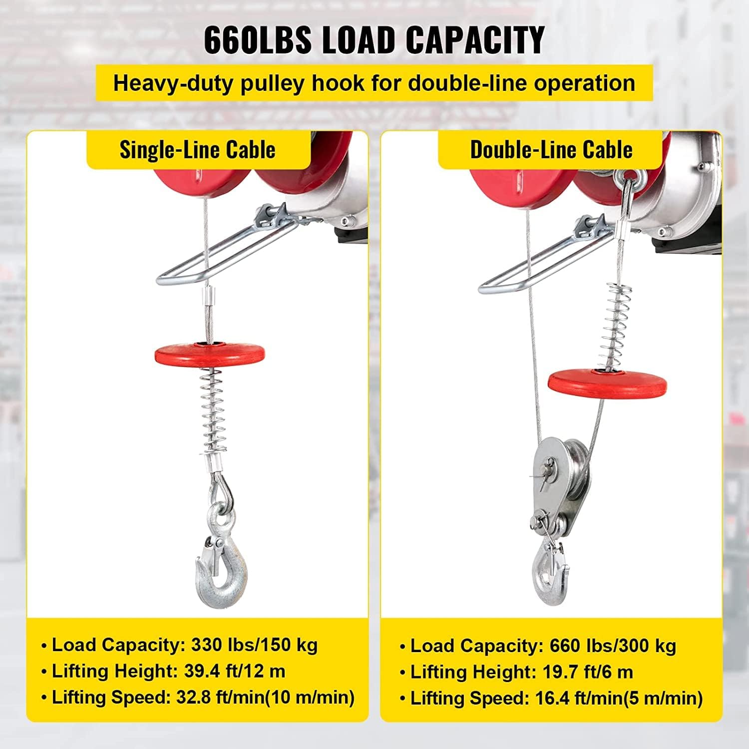 Wydajny podnośnik elektryczny – moc wejściowa: 550 W. Silnik w pełni miedziany o dobrej przewodności cieplnej i elektrycznej prowadzi do niskiego zużycia energii. Nasz produkt charakteryzuje się szybkim chłodzeniem, jest odporny na wysokie temperatury i zapewnia doskonały efekt biegania. Duża pojemność skokowa – dzięki elektrycznemu podnośnikowi, który podnosi z prędkością do 5 m/min (łatwo) i 16 m/min (podwójnie), praca jest wykonywana szybciej i bezpieczniej. Posiada dwie metody użytkowania. Pojemność pojedynczej / podwójnej linii: 150 kg, 300 kg. Wytrzymała i stabilna – ta elektryczna wciągarka składa się ze stalowego domu A3, haka ze stali stopowej i liny drucianej o długości 10 m, jest zaprojektowana do długotrwałego użytkowania i zapewnia stabilność pracy. 【Ochrona bezpieczeństwa】 – Wyposażony w wyłącznik krańcowy i sprężynę buforową, która zmniejsza kołysanie się i ze względów bezpieczeństwa zapobiega przekroczeniu łańcucha. Dzięki temu elektrycznemu podnośnikowi możesz stać w bezpiecznej odległości podczas podnoszenia przesyłanych za pomocą pilota zdalnego sterowania. Zawsze dbamy o Twoje bezpieczeństwo. Szeroki zakres zastosowania – nadaje się do fabryk, magazynów, budownictwa, wyciągów towarów, budownictwa, przedsiębiorstw kolejowych, przemysłowych i górniczych i innych. Nadaje się do trudnych warunków wewnętrznych lub zewnętrznych.