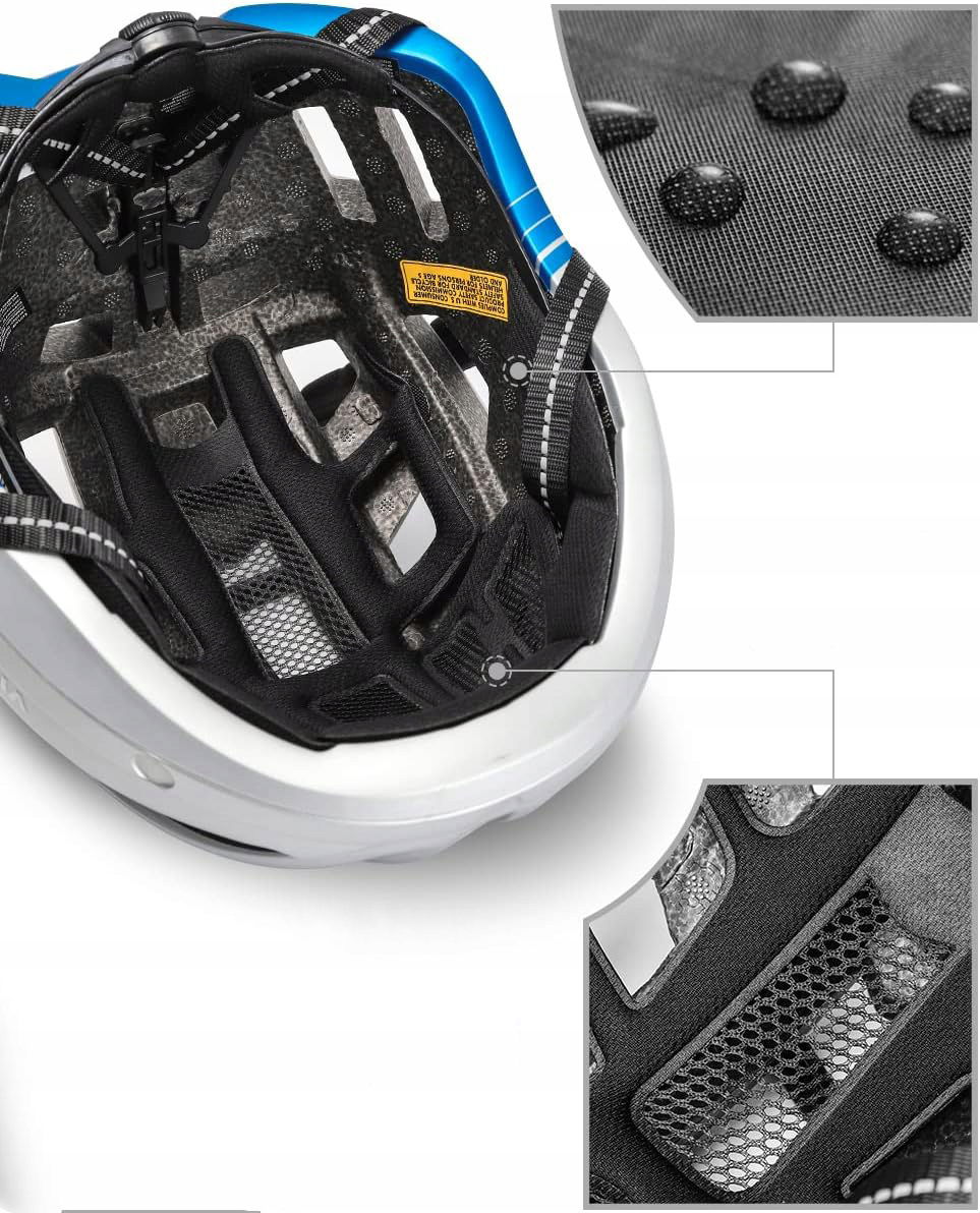 Wbudowane tylne światło LED z trzema trybami świecenia zwiększa widoczność rowerzysty na drodze, szczególnie po zmroku. Pokrętło regulacyjne z tyłu kasku umożliwia łatwe dopasowanie do obwodu głowy, zapewniając stabilność i wygodę podczas jazdy.