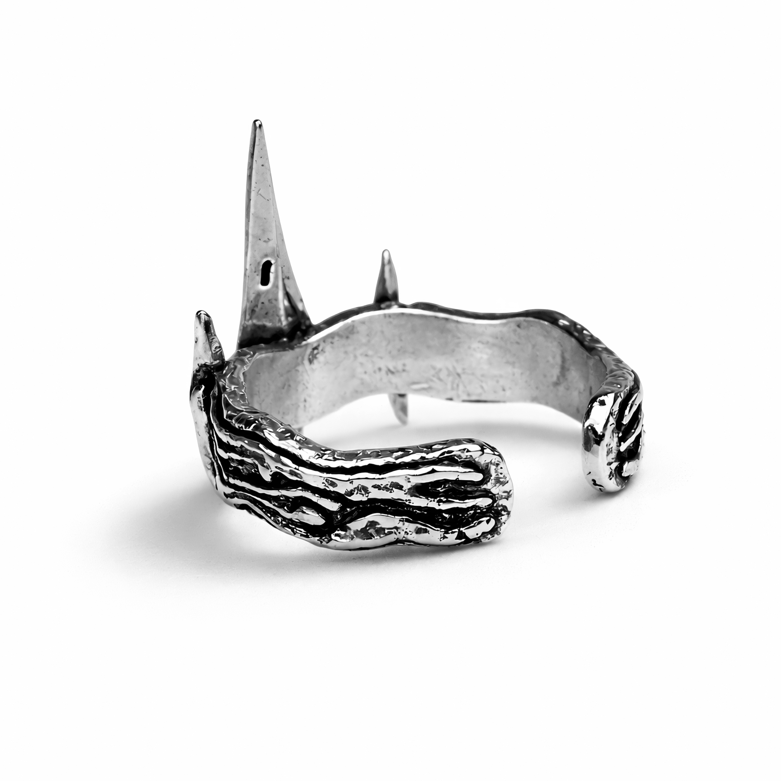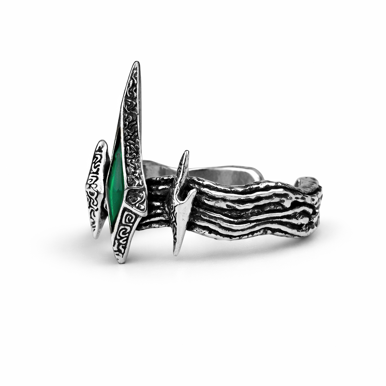 Z mgieł Wysp Cienia historia Viego potrafi usiąść na dłoni jak lodowata korona — pierścień Viego Crown niesie w sobie klimat Ruiny idealny do kolekcji, cosplayu albo po prostu mocnego akcentu na co dzień. Wykonany z metalu i z regulowanym rozmiarem, wygląda jak artefakt, nie “zwykła biżuteria”: z przodu wyrasta wysoki, koronny szpic, który oprawia głęboko szmaragdowo-zielony, podłużny kamień łapiący światło jak upiorny blask. Po bokach są ostre “kolce”, a na głównym elemencie i mniejszych ostrzach widać wijące się, runiczne grawerunki. Obrączka ma warstwową, falującą fakturę z przyciemnionymi zagłębieniami, dzięki czemu srebrny połysk dostaje antycznego, “wybitego w boju” charakteru. Otwarta konstrukcja pozwala dopasować pierścień, a gładkie wnętrze sprawia, że da się go nosić długo bez dyskomfortu. Czy robisz ekspozycję na półce, dopinasz klimat do ita baga, czy domykasz stylizację inspirowaną Ruined Kingiem — ten pierścień oddaje atmosferę Wysp Cienia i nawiązuje do poszarpanej, “koronnej” sylwetki znanej z gry. Świetnie wygląda też jako ozdoba na biurku między meczami. Załóż, dopasuj i dorzuć do swojej rotacji jako wyrazisty prezent dla fana — albo dla siebie.