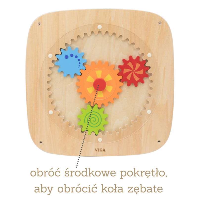 Poznaj wspaniałą zabawkę edukacyjną, która rozwija zdolności manualne i logiczne myślenie Twojego dziecka! Ta tablica ścienna z kolorowymi kołami zębatymi VIGA to nie tylko świetna zabawa, ale także narzędzie do nauki. Dziecko może obracać pokrętłem, aby wprawić w ruch wszystkie kółka. Ząbkujące się koła zębate sprawiają, że obracają się wszystkie jednocześnie, co pozwala na zrozumienie pojęcia „siły i ruchu”.Kółka mają różne wzory, dzięki czemu podczas obracania tworzą efekty wizualne. Zabawka jest w całości wykonana z drewna, co zapewnia jej trwałość i bezpieczeństwo. Doskonale sprawdzi się jako element większej ściany aktywności w pokoju dziecka, przedszkolu, czy żłobku. To idealna propozycja dla każdego malucha, który jest ciekawy świata!