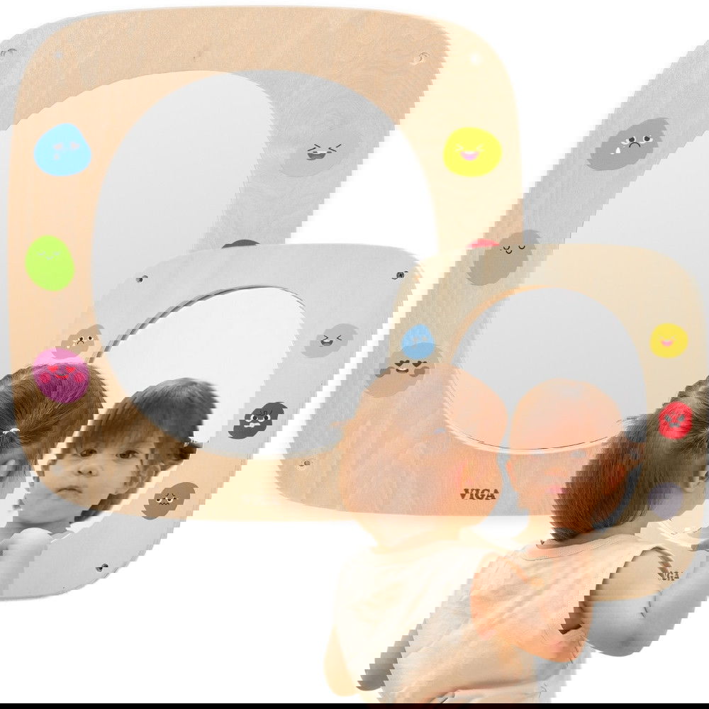 Ta drewniana tablica od marki Viga to idealne narzędzie do nauki poprzez zabawę, stworzone z myślą o małych dzieciach. Produkt pomaga w rozwoju emocjonalnym i motorycznym, pozwalając maluchom na odkrywanie świata emocji w interaktywny i angażujący sposób.W centrum tablicy znajduje się bezpieczne lusterko, otoczone sześcioma barwnymi, wyrazistymi twarzami, które przedstawiają różne emocje, takie jak radość, smutek, złość czy spokój. Dziecko może obserwować swoje odbicie i naśladować miny, co wspiera świadomość emocjonalną i pomaga w koordynacji mięśni twarzy. Tablica jest łatwa w montażu na ścianie, a jej solidna drewniana konstrukcja zapewnia trwałość i bezpieczeństwo podczas zabawy.