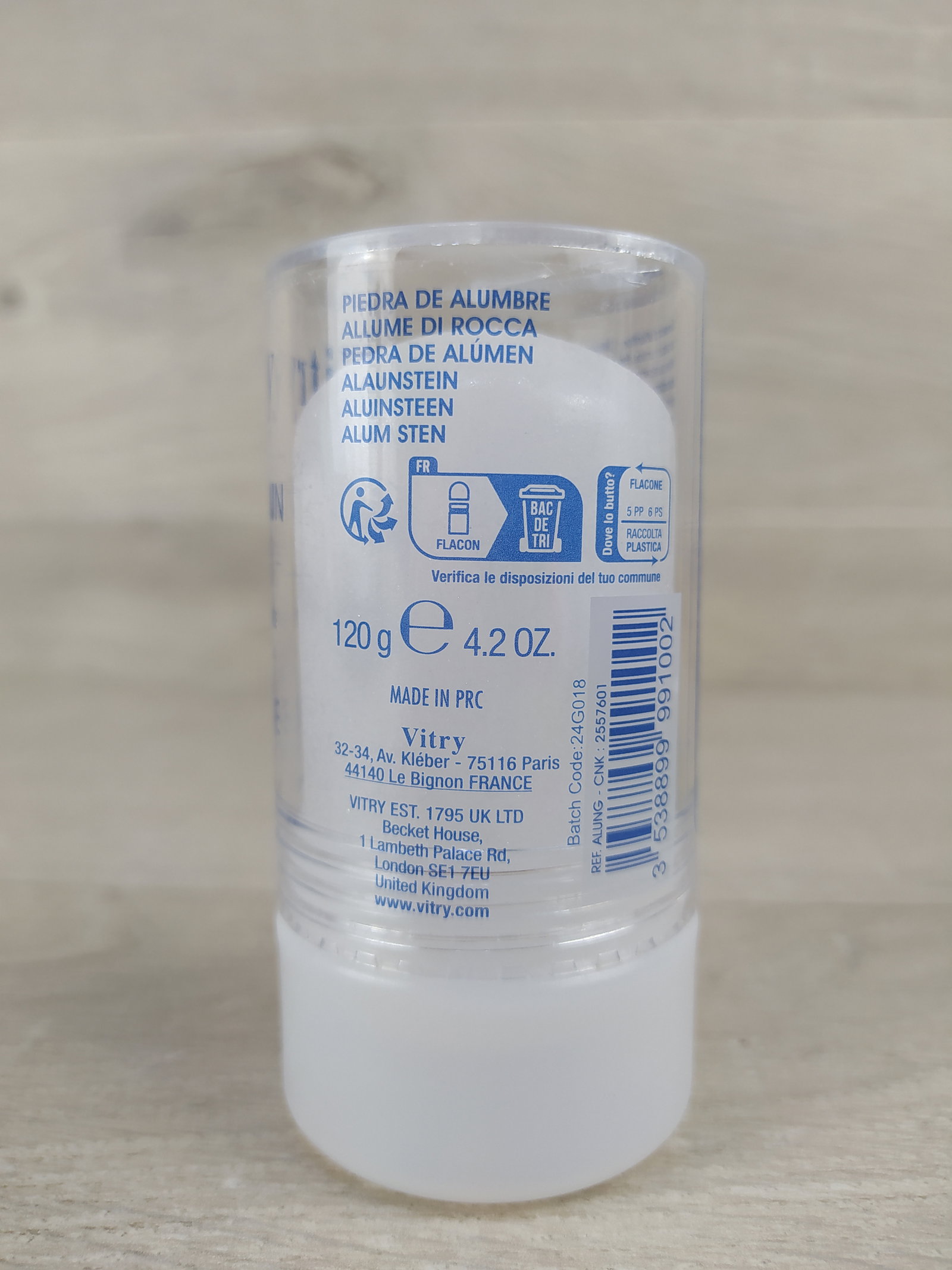 🧊 Vitry Pierre d'Alun 120 g – naturalny dezodorant w kamieniu W 100% naturalny dezodorant mineralny w formie kamienia ałunowego. Działa antybakteryjnie, neutralizuje nieprzyjemny zapach potu bez blokowania jego wydzielania. Odpowiedni dla skóry wrażliwej, bezzapachowy, bez alkoholu i konserwantów. Może być stosowany również po goleniu – działa ściągająco i łagodząco.