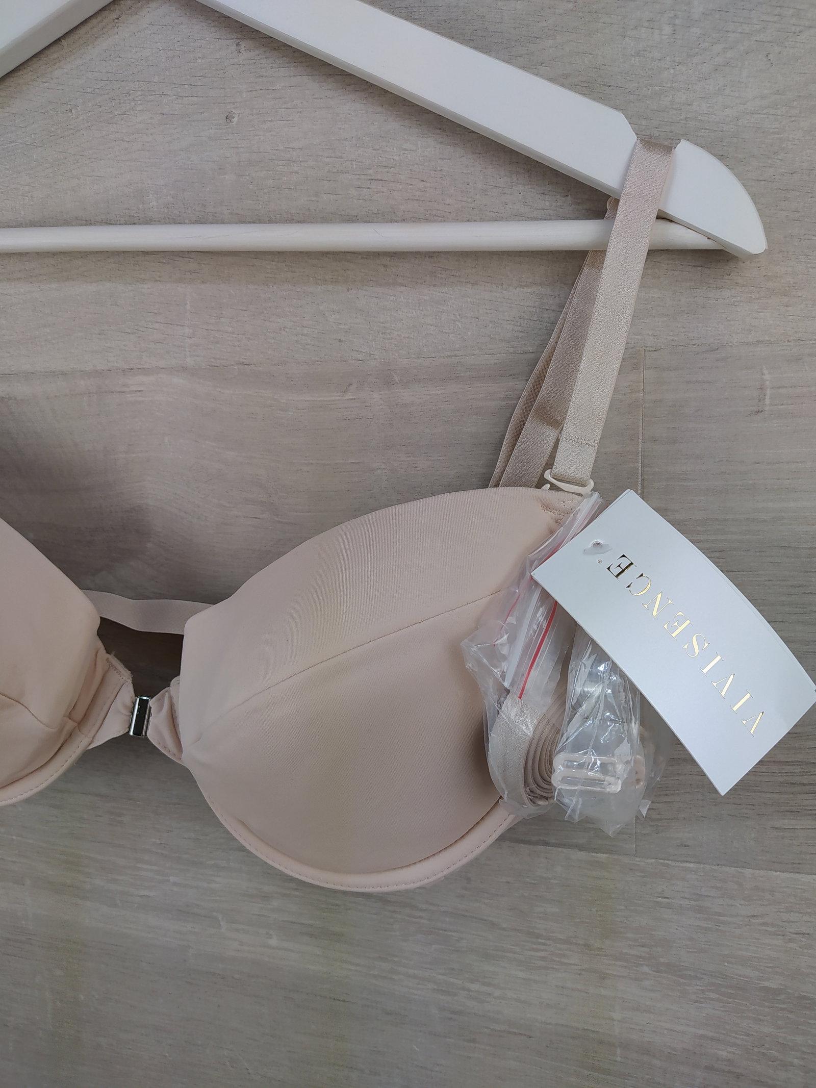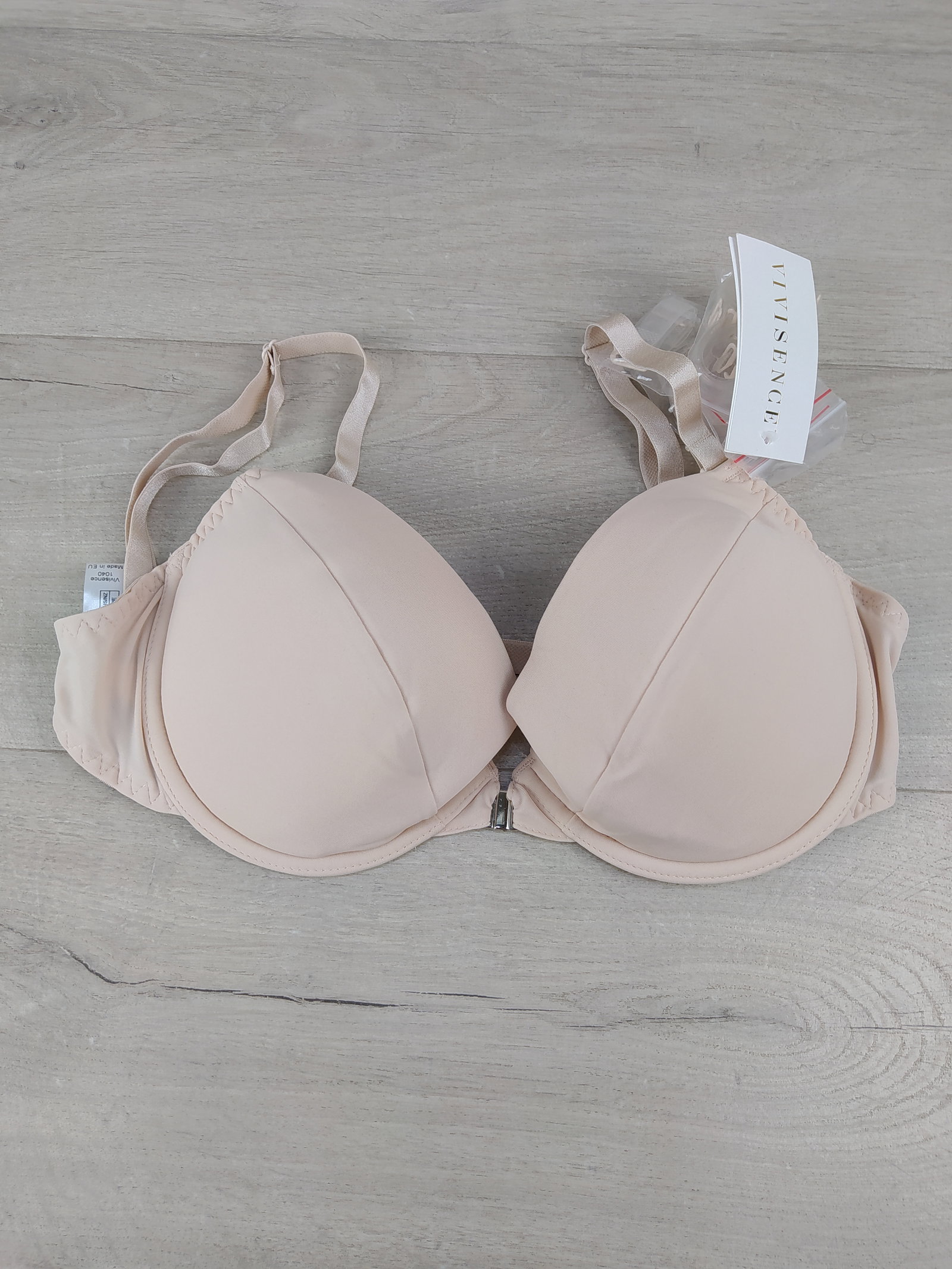 Vivisence 1040 Backless Push-Up Bra to elegancki biustonosz damski w kolorze beżowym, stworzony z myślą o kreacjach z odkrytymi plecami. Dzięki specjalnej konstrukcji z przezroczystym pasem tylnym i regulowanymi ramiączkami, pozostaje niemal niewidoczny pod ubraniem, jednocześnie zapewniając stabilne podtrzymanie biustu.