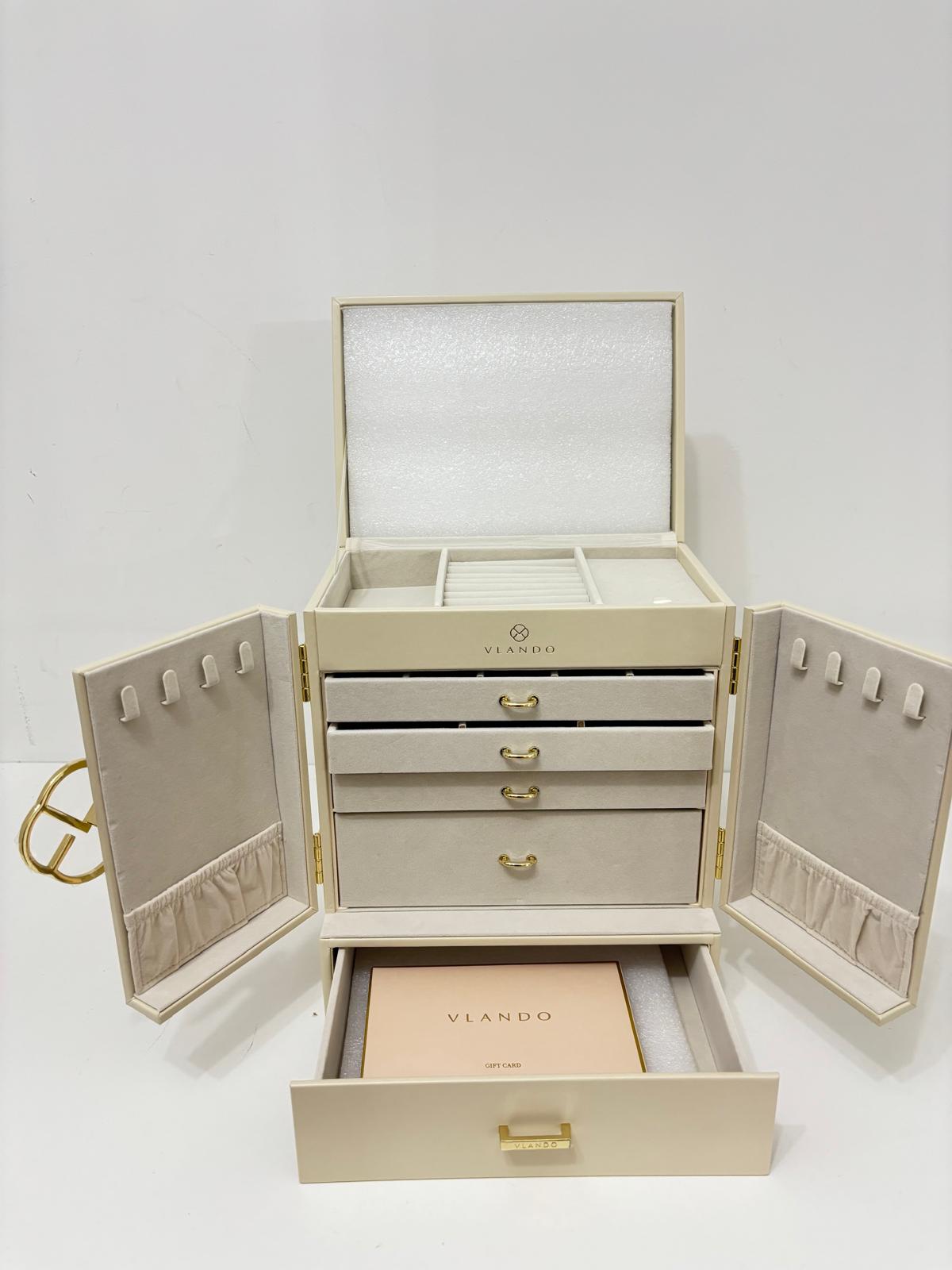 Elegancka, pojemna i dopracowana w każdym detalu szkatułka na biżuterię marki VLANDO to idealne rozwiązanie dla kobiet, które chcą przechowywać swoją biżuterię w sposób stylowy i uporządkowany. Inspirowana francuską architekturą i klasyczną elegancją – zachwyca formą i funkcjonalnością.