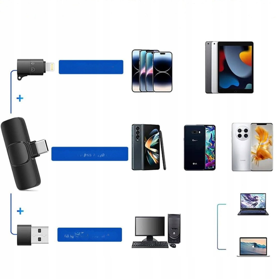 - Pełna kompatybilność: ulepszony mikrofon bezprzewodowy jest wyposażony w złącza LIGHTNING, USB-C oraz USB-A, dzięki czemu działa z telefonami z Androidem (Huawei, Honor, Samsung itd.), iPhone’ami, iPadami, laptopami i komputerami. Uwaga: na telefonach z Androidem mikrofon obsługuje wyłącznie rozmowy telefoniczne i czaty online.