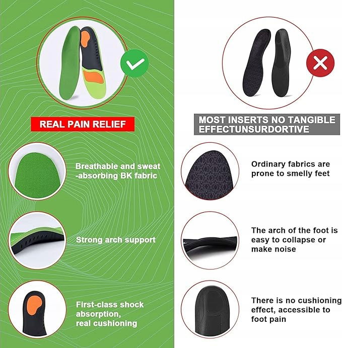 【3,5 cm wsparcia łuku】Zapewnia wysokie wsparcie łuku, skutecznie łagodzi ból stóp takich jak płaskie stopy, zapalenie powięzi podeszwowej, metatarsalgię, pięty, ścięga Achillesa oraz łagodzi kolana, nogi i plecy.