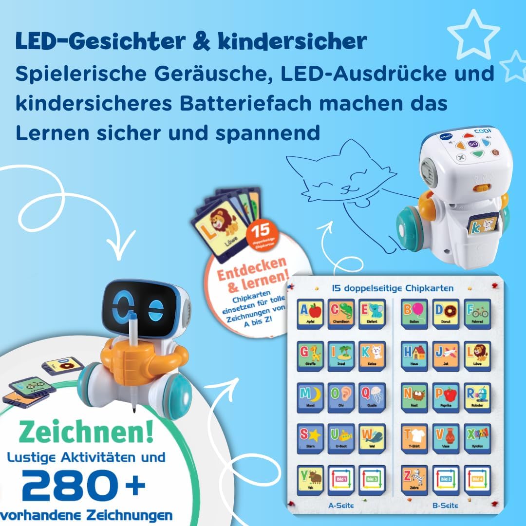 rozpoznaje rozmiar papieru, może trzymać długopis i reaguje na włożenie karty chipowej – wystarczy włożyć jedną z 15 kart chipowych i pozwolić narysować ulubiony obraz
