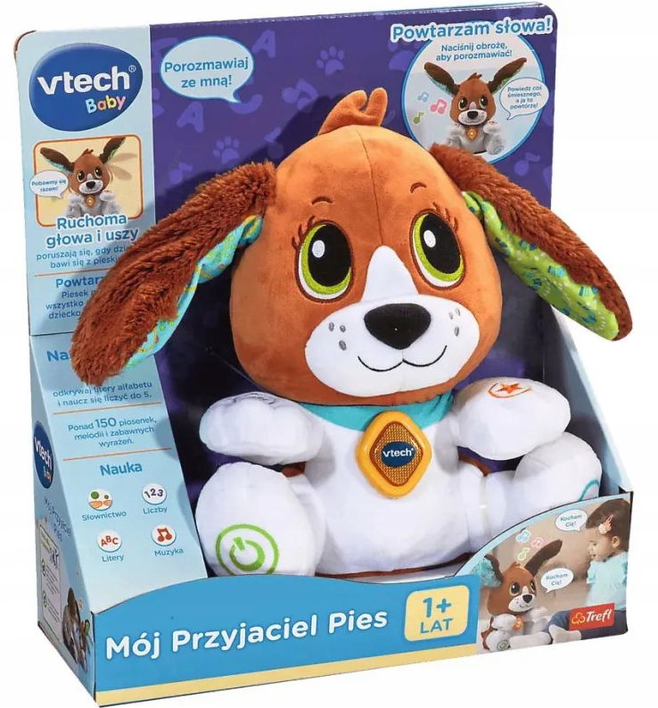 Mój Przyjaciel Pies marki VTech to uroczy, interaktywny piesek stworzony specjalnie dla najmłodszych dzieci. Piesek radośnie porusza głową i uszkami, naśladując słuchanie. Posiada także 5 przycisków umieszczonych na swoich łapkach i brzuszku.
