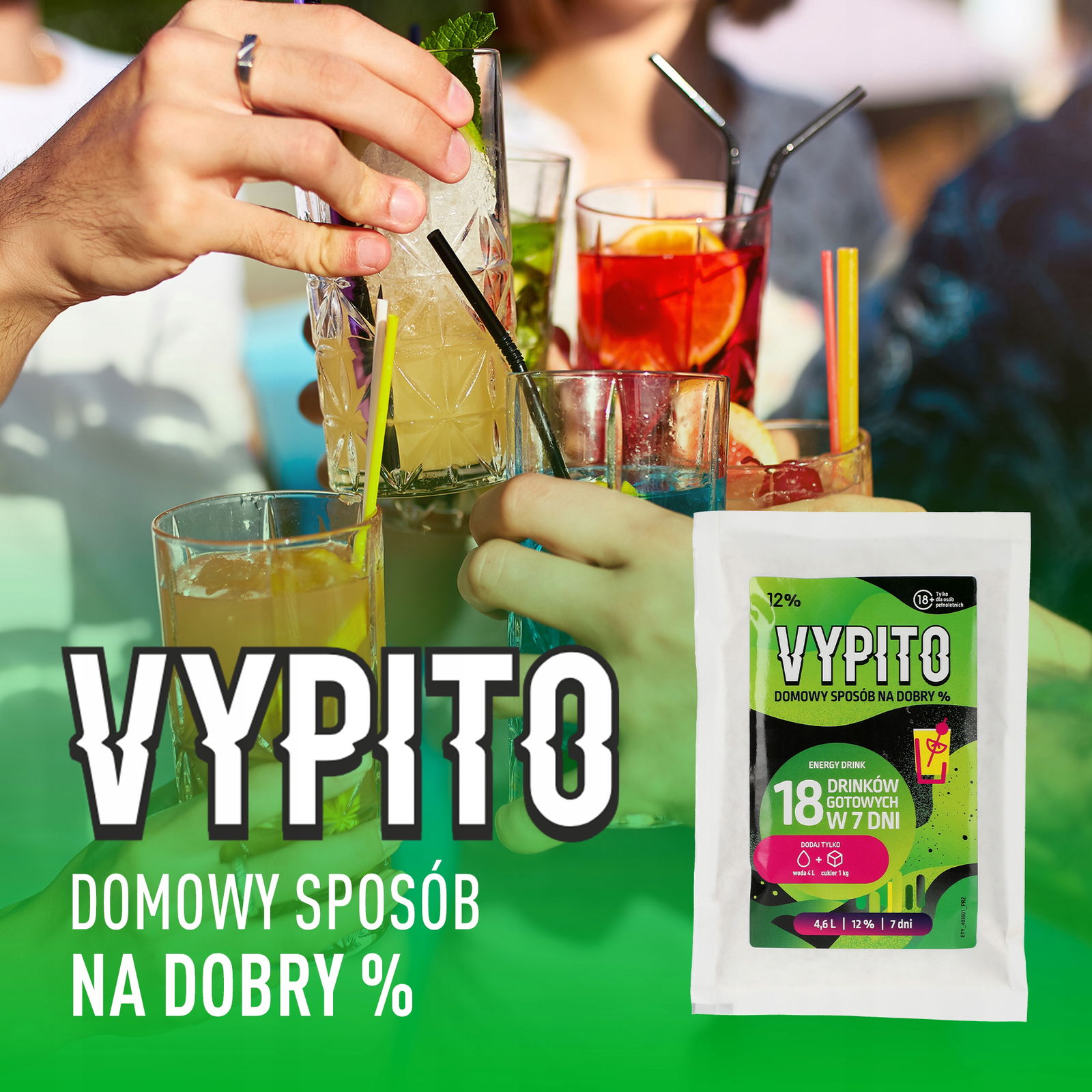 VYPITO to innowacyjny zestaw do samodzielnego przygotowania napojów alkoholowych, który umożliwia stworzenie 4,6 litra domowego drinka o zawartości 12% alkoholu. Dzięki Vypito możesz w prosty i szybki sposób skomponować do 18 orzeźwiających drinków, które zachwycą Twoich gości i urozmaicą każdą imprezę. Wystarczy, że użyjesz saszetki Vypito, cukru oraz wody, a po zaledwie 7 dniach fermentacji będziesz mógł cieszyć się własnoręcznie przygotowanym trunkiem.