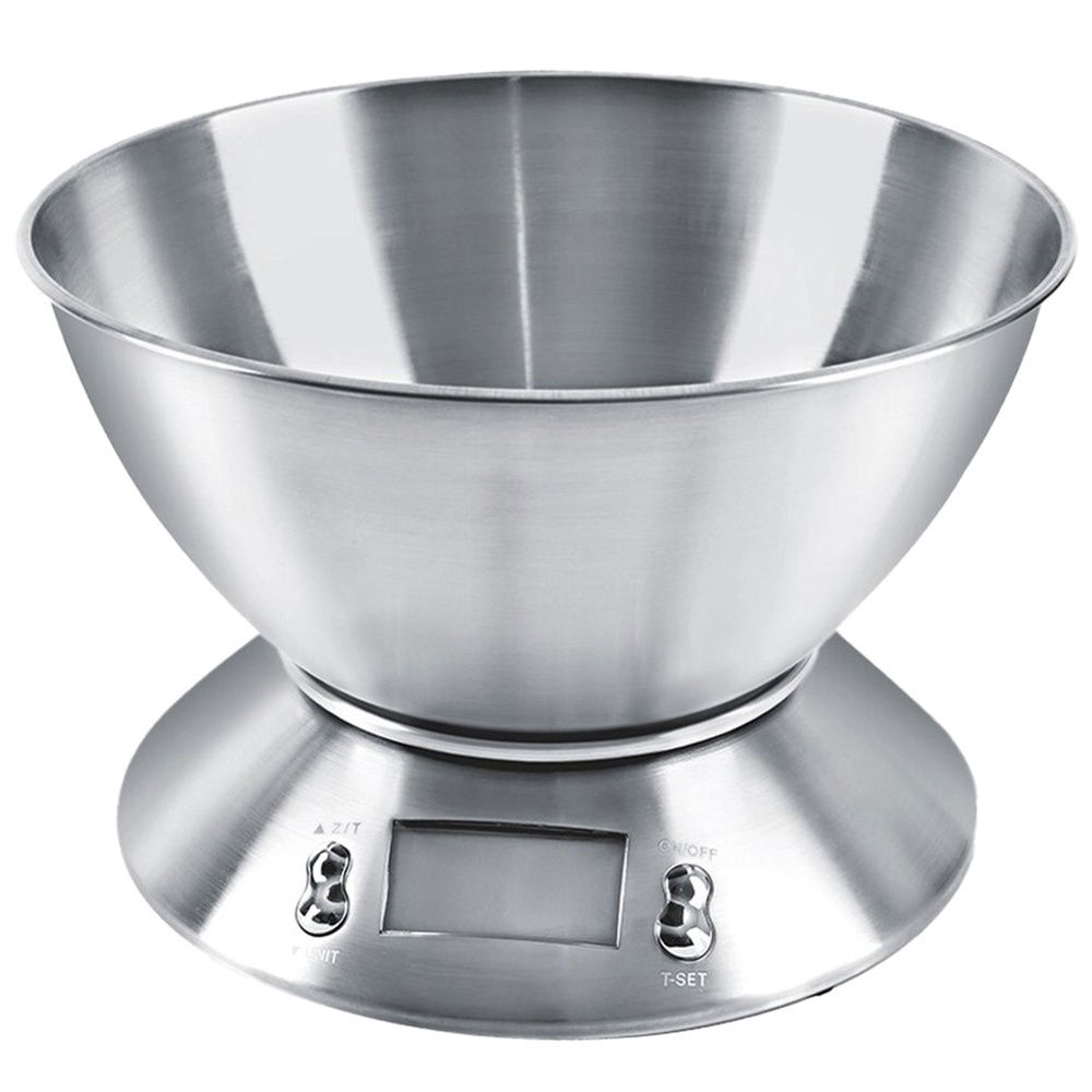Cyfrowa waga kuchenna z miską - Praktyczna waga kuchenna wyposażona w cyfrowy wyświetlacz oraz odpinaną miskę. Maksymalny udźwig wagi wynosi 5 kg, a dokładność pomiaru to 1 g. Miska ma pojemność 2,2 l, wysokość 9 cm i średnicę 21,5 cm. Wymiar zewnętrzny miski z wagą to 21,5 x 21,5 x 14,5 cm. Wyposażona w antypoślizgowe nóżki, dzięki czemu nie przesuwa się w trakcie użytkowania.