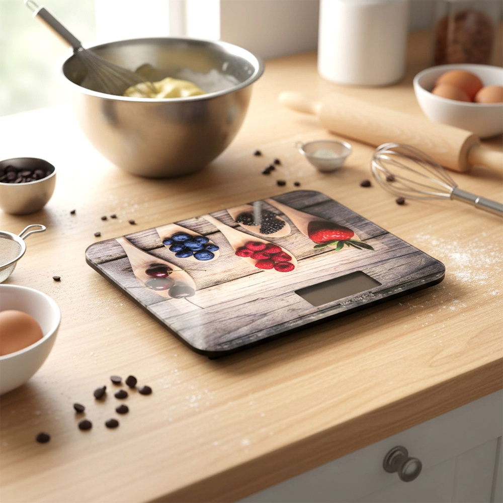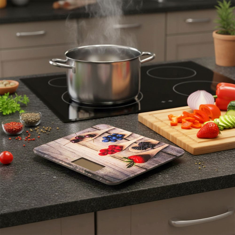 Wykonana z hartowanego szkła - Waga wykonana z hartowanego szkła oraz wysokiej jakości tworzywa. Posiada efektowny, kuchenny dekor na powierzchni, przedstawiający owoce.