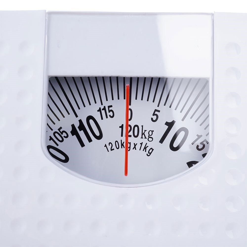 MECHANICZNA - Waga wyposażona jest w analogowy mechanizm pomiaru masy ciała, a jej maksymalny pomiar wynosi 120 kg. Posiada czytelną tarczę ze skalą i podziałką co 1 kg oraz nieruchomą wskazówkę, która pokazuje wagę osoby, która weszła na wagę.