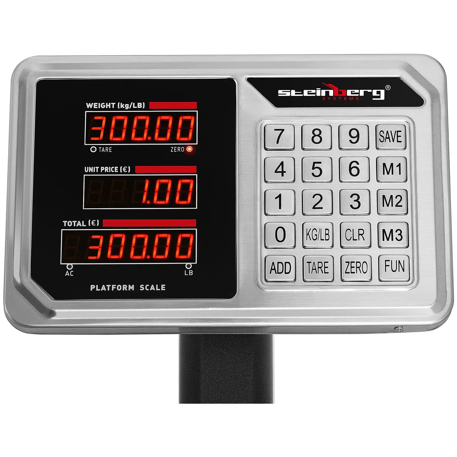 Kod producenta: 10030526Waga platformowa marki Steinberg Systems to element wyposażenia poczty, magazynu, sklepu, punktu logistycznego, fabryki czy warsztatu oraz punktu handlowo usługowego, zakładu produkcyjnego czy przetwórczego. Odznacza się solidnością i wysoką jakością wykonania, co przekłada się na długą, intensywną eksploatację. Urządzenie waży przedmioty w zakresie 1-300 kg z wysoką dokładnością 50 g. Duża platforma 40 x 50 cm nadaje się do określania wagi zarówno mniejszych paczek, jak i większych gabarytowo przesyłek. W przypadku przeciążenia wyświetla się stosowny komunikat. Wagę wyposażono w opcje: określenia ceny, tarowania, zerowania, zliczania sztuk, dodawania, kalibracji, resetowania, a także zmiany jednostek (kg, Ib). Łatwa obsługa wagi Steinberg Systems wynika z 3 umieszczonych na terminalu wyświetlaczy LED (okno wagi, ceny i całkowitej kwoty). Wysokie na 15 mm cyfry są bardzo czytelne. Energooszczędne urządzenie wyłącza się po 3 s nieużywania. Po naładowaniu (można korzystać z wagi w jego trakcie) bateria zapewnia pracę do 96 h. Przekłada się to na wyjątkową mobilność. W zestawie znajduje się zasilacz 7 V / 500 mA. Długą żywotność zagwarantowano dzięki użyciu wysokojakościowych materiałów: stali nierdzewnej (platforma), stali malowanej proszkowo (rama), a także zabezpieczeniu klawiatury przed wodą i tłuszczem. Stabilna konstrukcja wspiera się na 4 regulowanych nóżkach. Statyw w razie potrzeby można złożyć, co usprawnia transport.Cechy produktu: