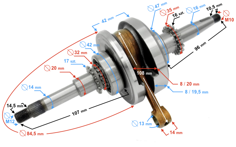 - długość całkowita dłuższego ramienia wału: 107 mm