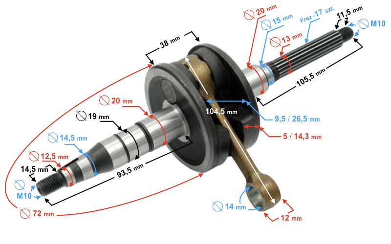 - długość całkowita dłuższego ramienia wału: 105,5 mm