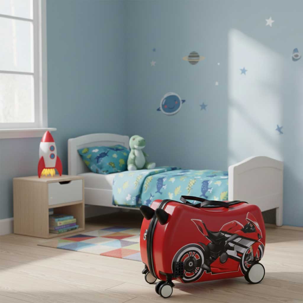 Ta walizka podróżna dla dzieci wygląda jak mini-motocykl gotowy do startu. To nie jest zwykła walizka dziecięca - to mała maszyna przygód, która zamienia lotnisko w tor jazdy. Jako walizka bagaż podręczny i kompaktowa walizka kabinowa, spełnia wymagany rozmiar walizki kabinowej w wielu liniach lotniczych, pozwalając zabrać cały dziecięcy bagaż podróżny bez zbędnych kompromisów.