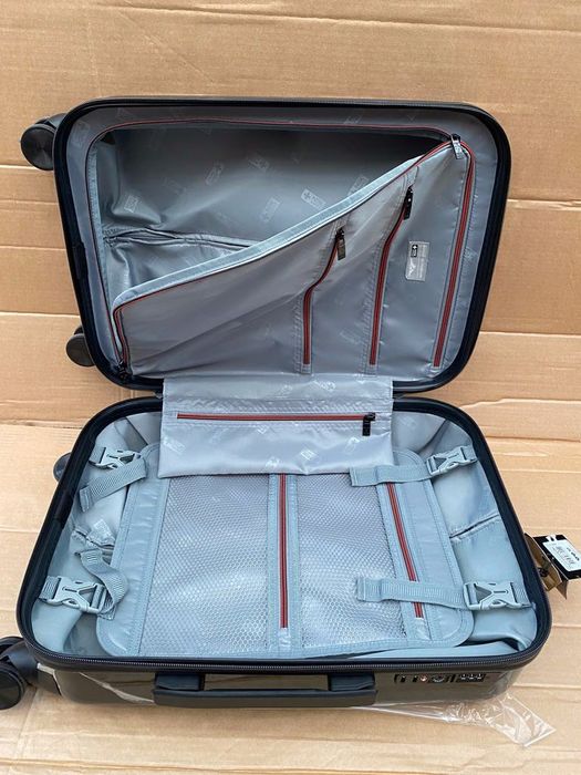 Teleskopowy metalowy uchwyt 4 x 360° podwójne kółka Jedna komora bagażowa z pasami Jedna komora w pokrywie zapinana na zamek błyskawiczny 2 uchwyty do przenoszenia Zamek szyfrowy Pojemność: ok. 32 l