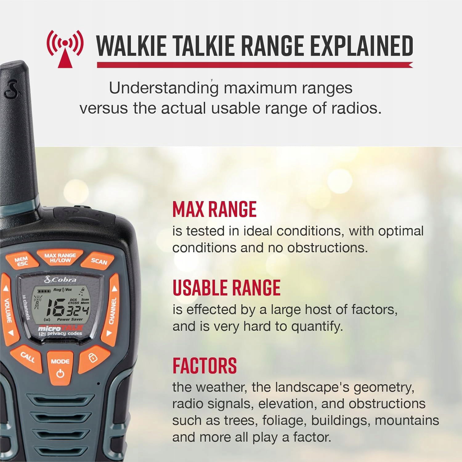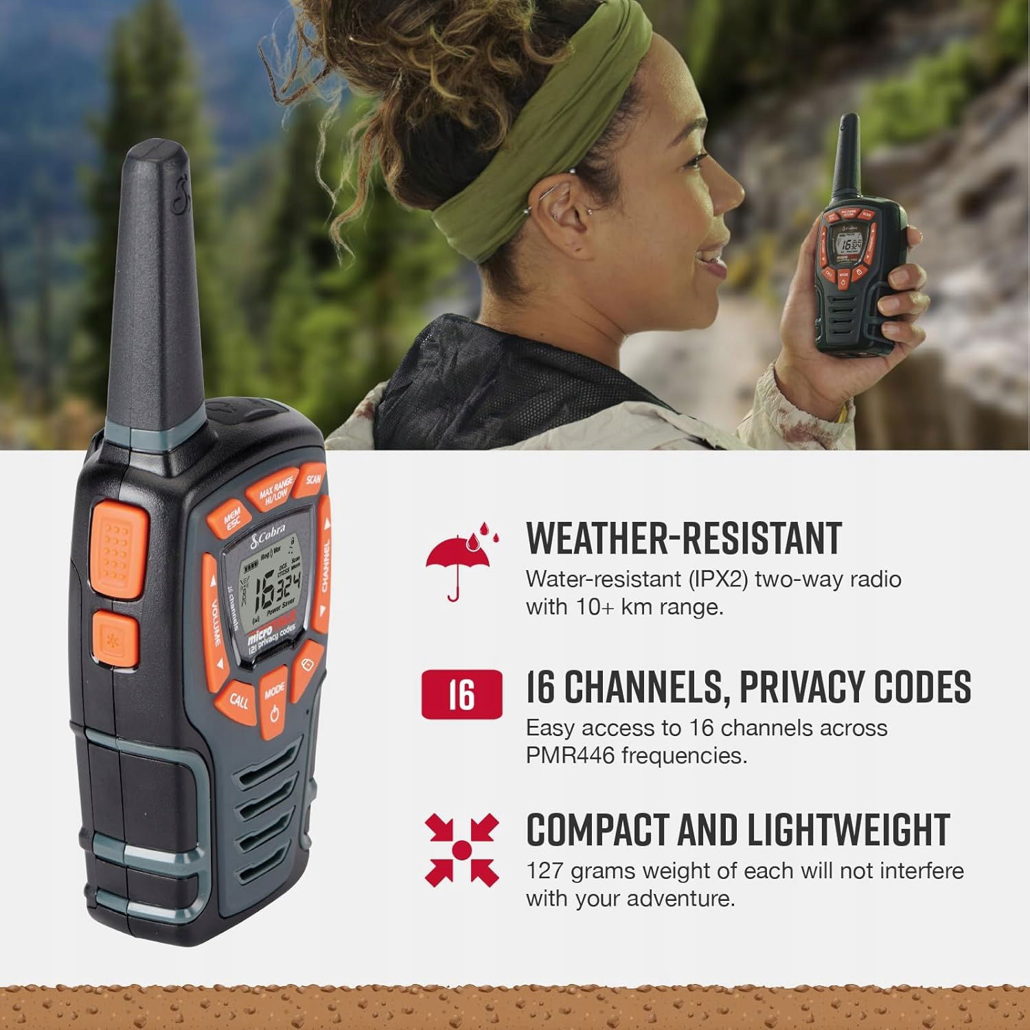 Do dyspozycji jest 16 kanałów, 121 kodów prywatności i łącznie 1963 kombinacje. Urządzenia są w pełni kompatybilne z innymi krótkofalówkami Cobra PMR446.