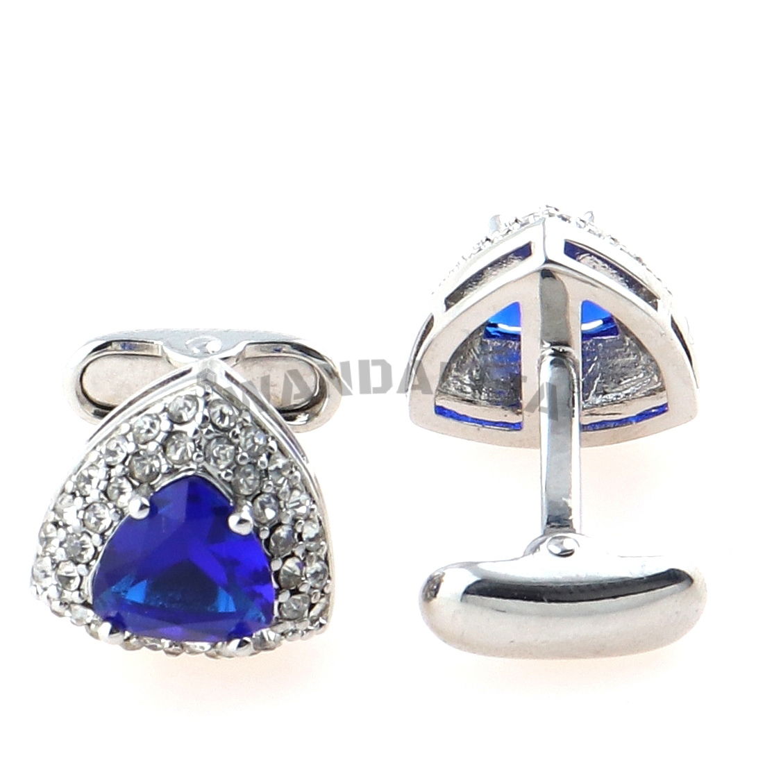 Spinki trójkątne, polerowane z zakutymi kryształkami stras imitującymi diamenty. Charakteru dodaje czysty i głęboki w barwie, duży, kryształowy Szafir, umieszczony w centrum spinki.