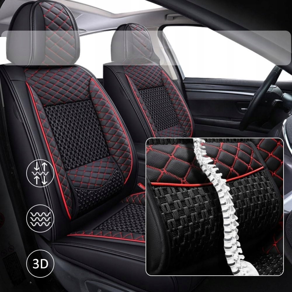 Pokrowce wykonane są z trwałej skóry PU z dodatkiem jedwabiu lodowego, co zapewnia miękkość, oddychalność i odporność na zużycie. Dzięki temu siedzenia pozostają wygodne nawet podczas długich podróży.