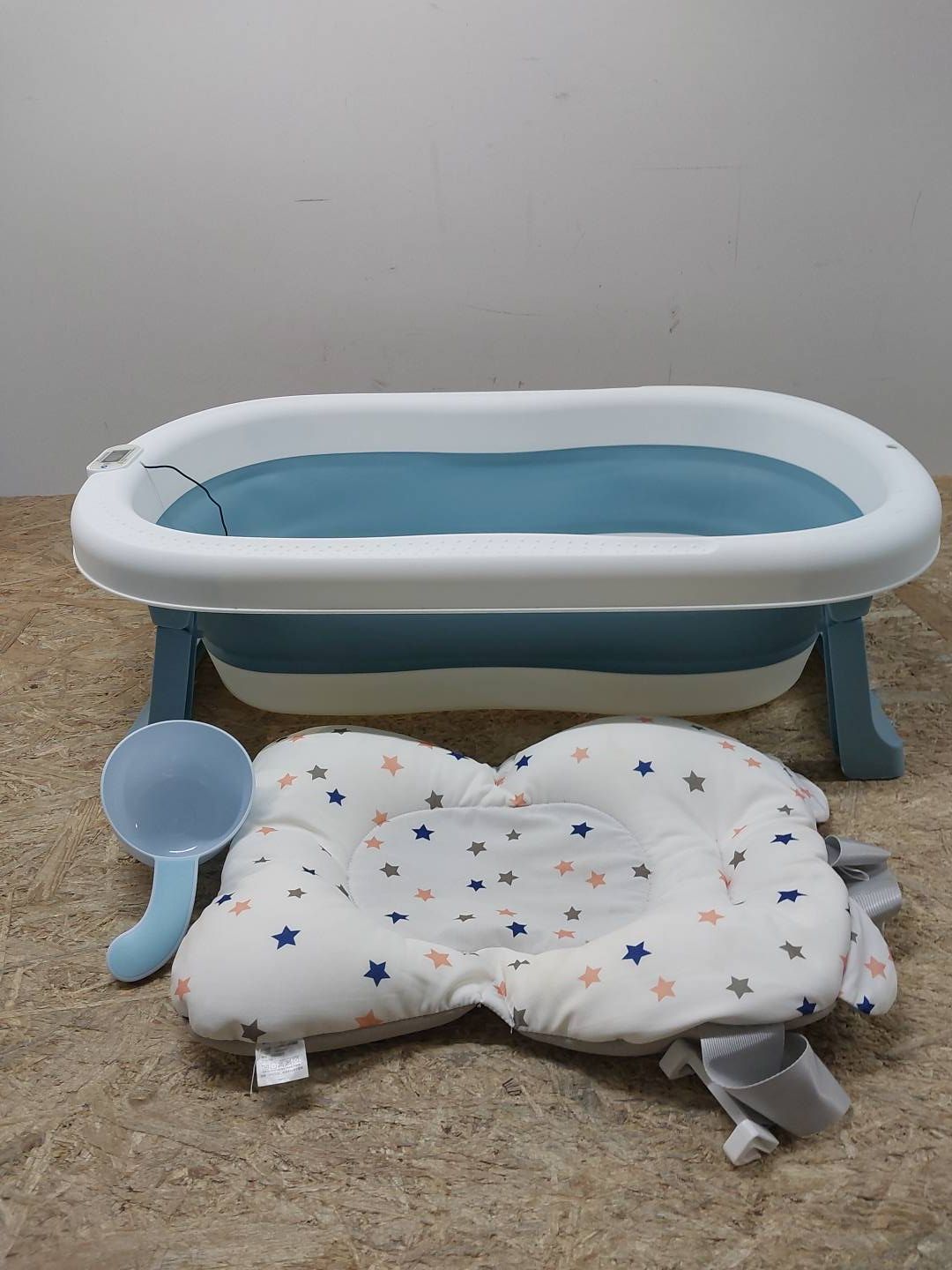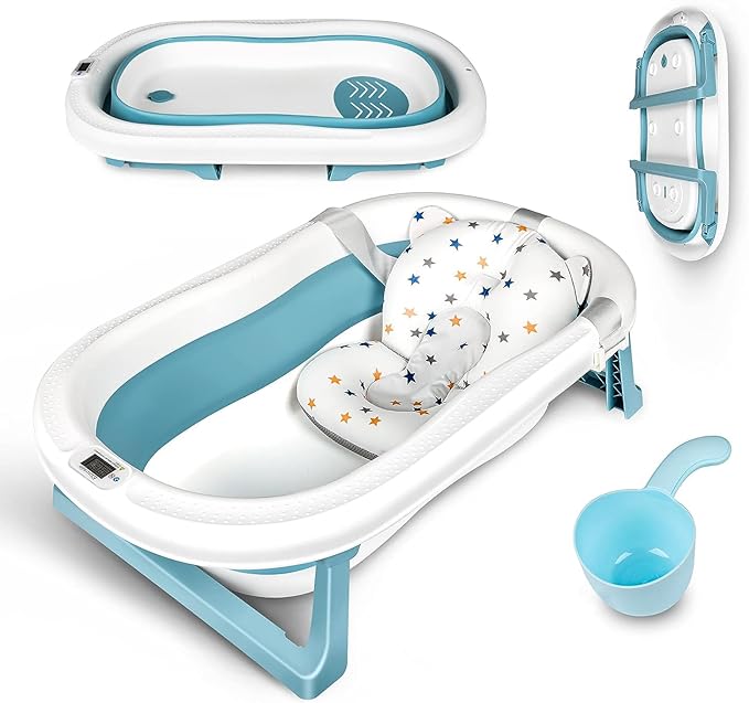 Duża, składana wanna dla niemowląt z wbudowanym termometrem, wanienka dla niemowląt z wkładką do wanny dla niemowląt, kubek do mycia włosów (niebieski (Z termometrem))