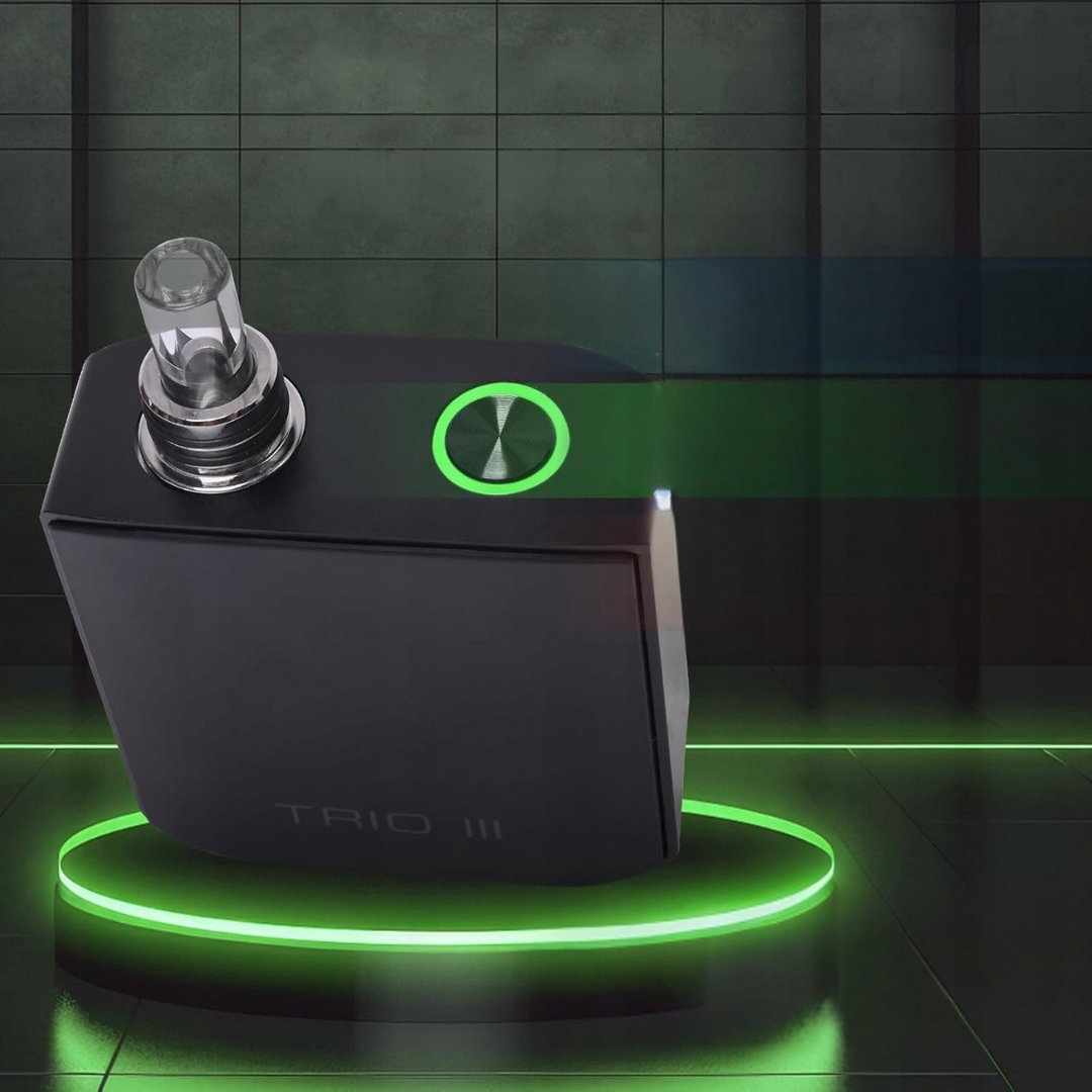 Przenośny waporyzator TRIO III to kompaktowe urządzenie przeznaczone do odparowywania suszu roślinnego, wosku lub CBD, obsługiwane za pomocą jednego przycisku sterującego z podświetleniem informującym o stanie pracy i baterii.