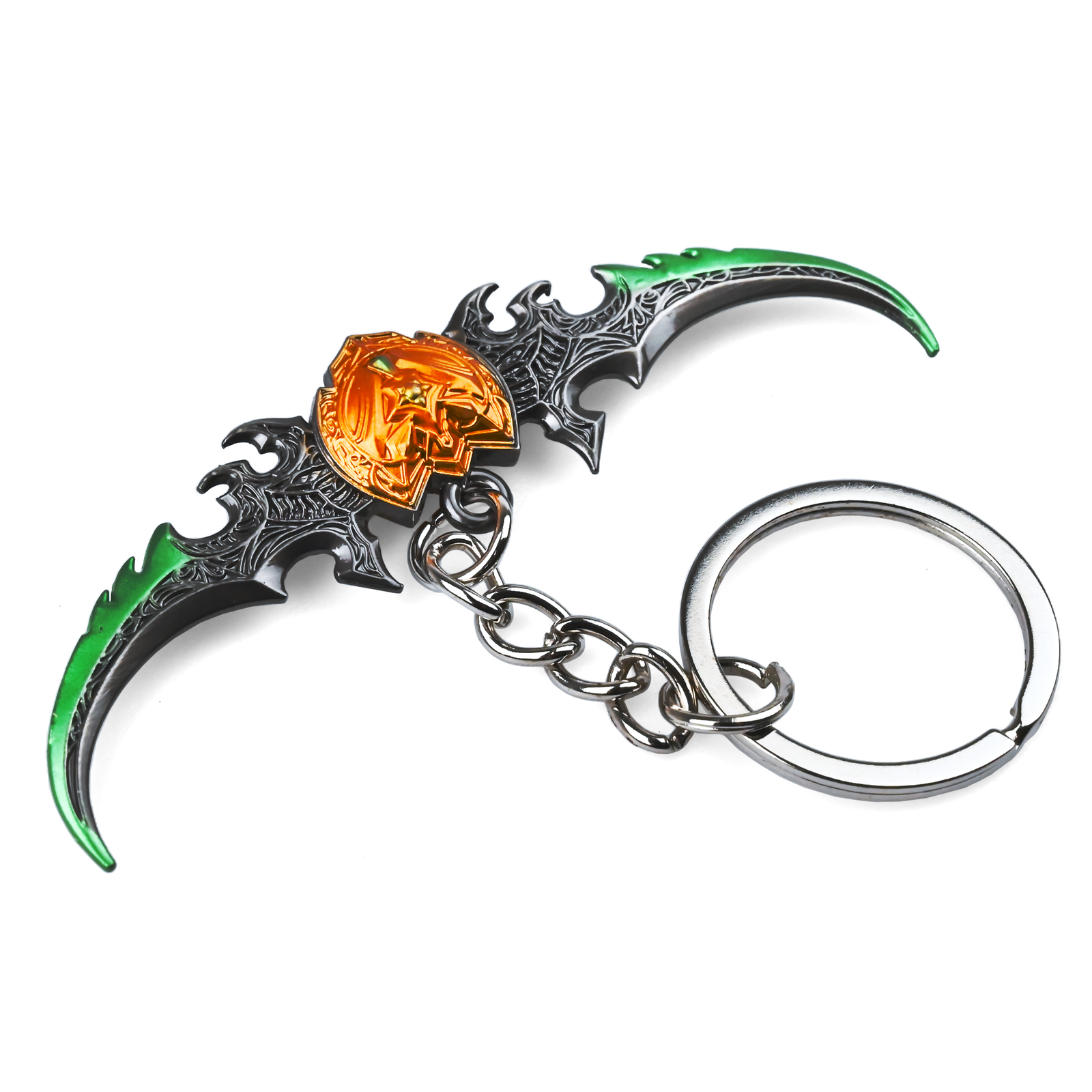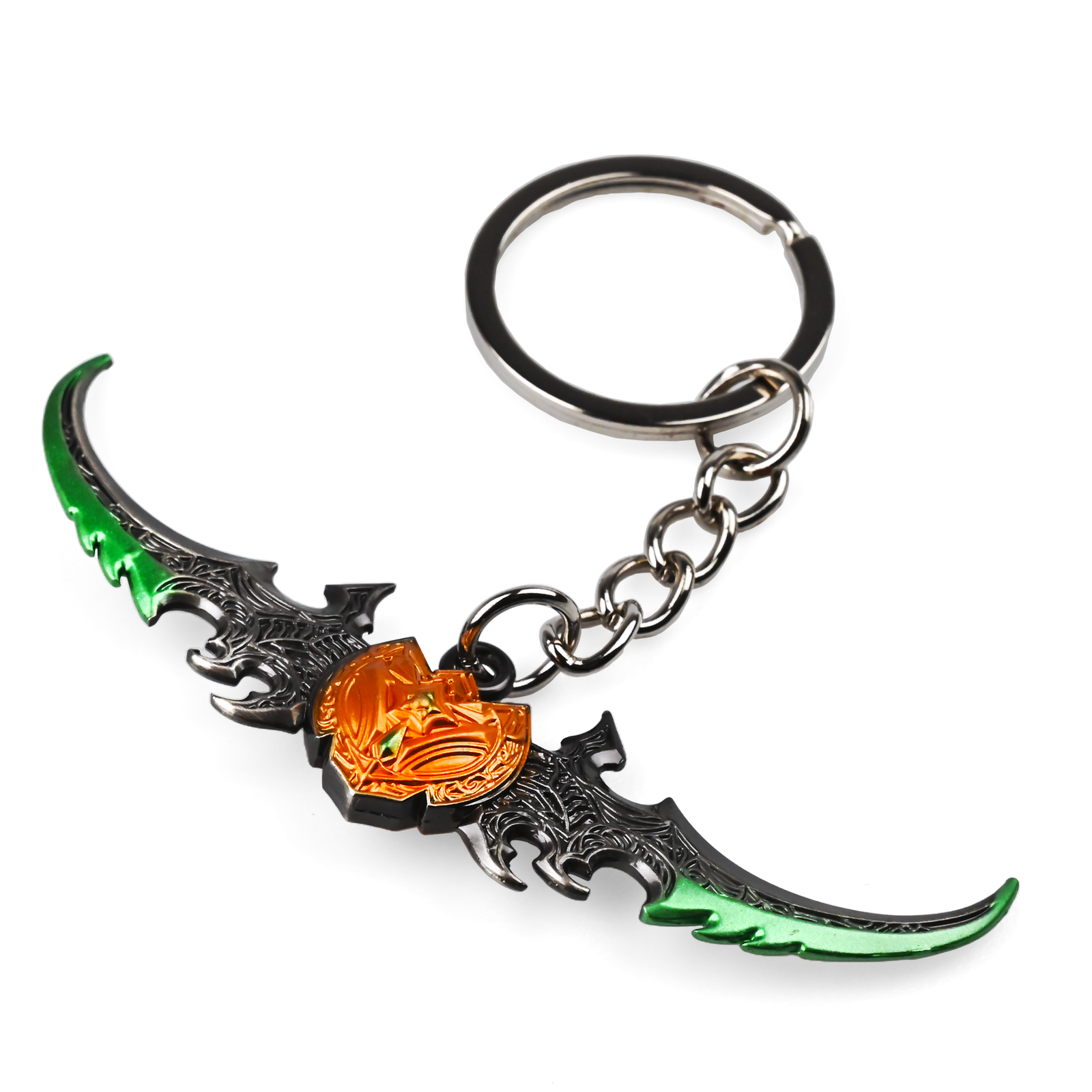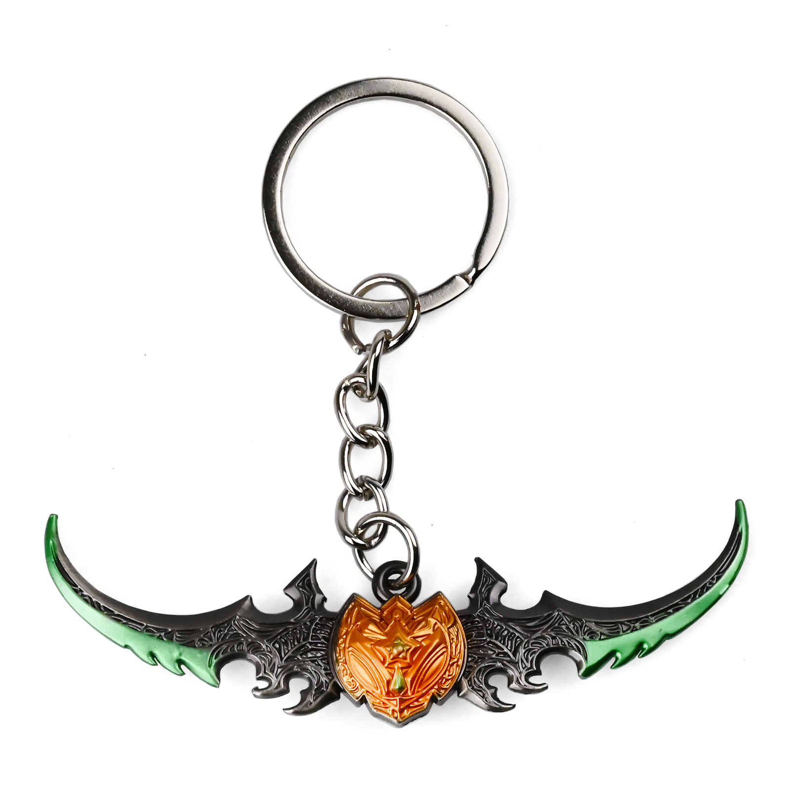 Wywodzący się z legendarnej zbrojowni Warcraft, brelok Warglaive of Azzinoth to imponująca, 7-centymetrowa Metalowa replika kultowej broni. Załączone zdjęcia ukazują starannie rzeźbione czarne ostrza z zielonymi akcentami oraz wyrazisty pomarańczowy emblemat w centrum. Ten Warcraft collectible doskonale sprawdzi się w codziennym użytku — można go przypiąć do kluczy, plecaka czy ustawić jako element ozdobny w pokoju gracza. Powstał, aby usatysfakcjonować wszystkich miłośników gaming fans merchandise i przyciągnąć wzrok solidnym wykonaniem, odzwierciedlającym klimat zaciętych bitew Azeroth. Uzupełnij swoją kolekcję o prawdziwy symbol uniwersum Warcraft, który podkreśli Twoje zaangażowanie w świat legendarnej rozgrywki. Stanowi też świetny prezent dla pasjonatów Warcraft.