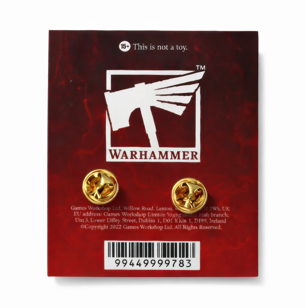 Oba piny mają błyszczące, emaliowane wypełnienia, eleganckie złote obramowanie i wyraźne, podniesione linie, które wyglądają naprawdę premium z bliska — jak żywcem wyjęte z estetyki kodeksów i battletomów. Każdy jest zapinany na złote zapięcie, więc możesz go bez stresu nosić na kurtce, plecaku, ita bagu, smyczy albo wpiąć w tablicę kolekcjonerską w kąciku hobby. Na opakowaniu widać branding Warhammer i czytelne informacje Games Workshop, więc całość ma fajny, „pamiątkowy” charakter już od pierwszego spojrzenia. Przypnij, złap trochę nostalgii i noś Warhammera na co dzień.