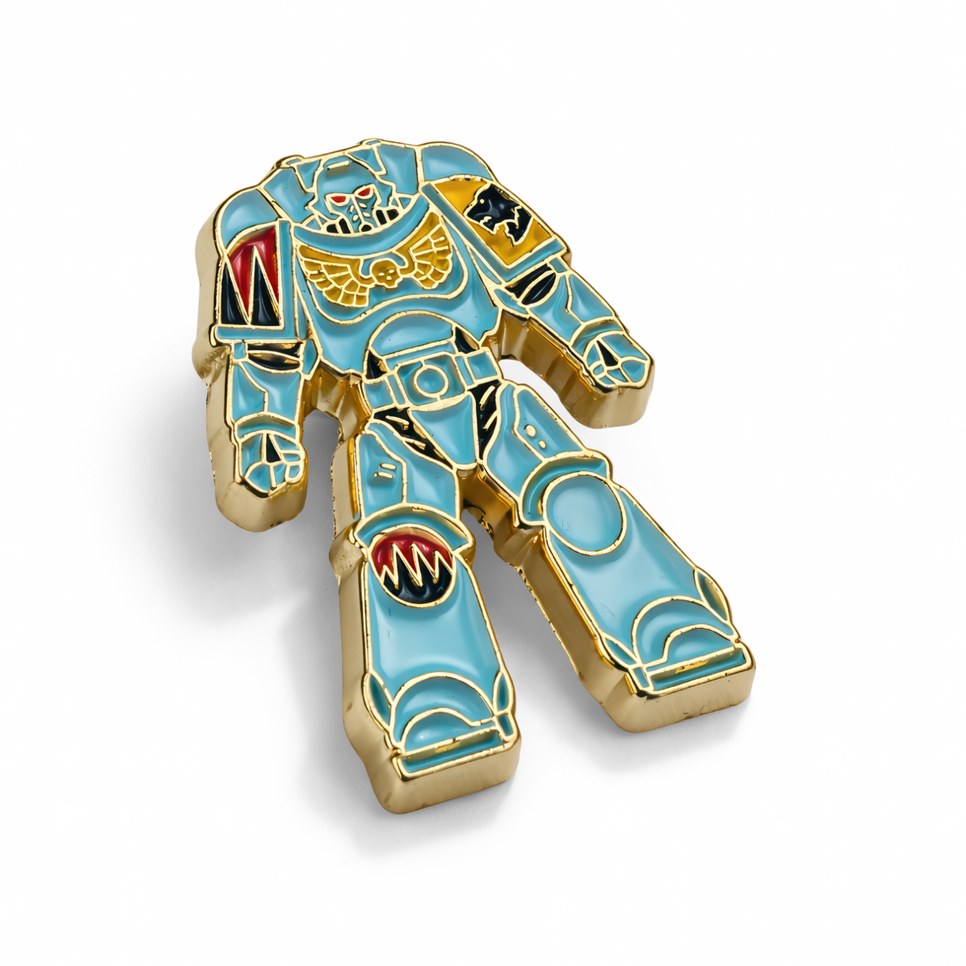 W mrocznej przyszłości i w światach śmiertelników liczą się znaki, barwy i heraldyka — dlatego ten zestaw Warhammer 2022 Store Anniversary aż prosi się, żebyś nosił(a) go z dumą. To duet metalowych pinów o rozmiarze 4 cm, przypięty do rocznicowej karty Warhammer Store Anniversary: pierwszy przedstawia złotego, opancerzonego bohatera z okrągłą tarczą ozdobioną słonecznym motywem na granatowym tle, a drugi to niebieski wojownik w pancerzu z uskrzydlonym emblematem na piersi, czerwonymi soczewkami oczu oraz czerwono-czarnymi detalami na ramieniu i kolanie. Ciepłe złoto i chłodny błękit dają ten „klasyczny Warhammerowy” klimat starcia bohaterów i świetnie odcinają się na ciemnych ubraniach albo obok figurek.
