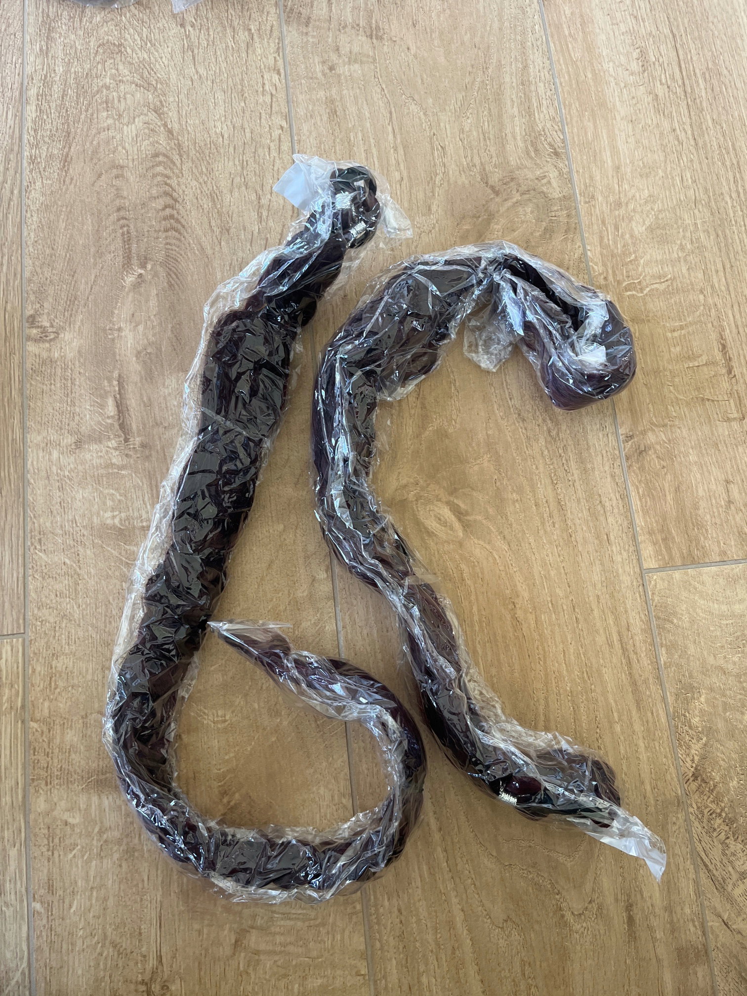 - Łatwy montaż: najpierw związuje się włosy w kucyk, następnie owija doczepiany warkocz wokół kucyka. Krótsze pasma oddziela się od dłuższych, dzieli włosy na 3 części i zaplata razem z syntetycznym pasmem, zabezpieczając przezroczystą gumką i wsuwkami.