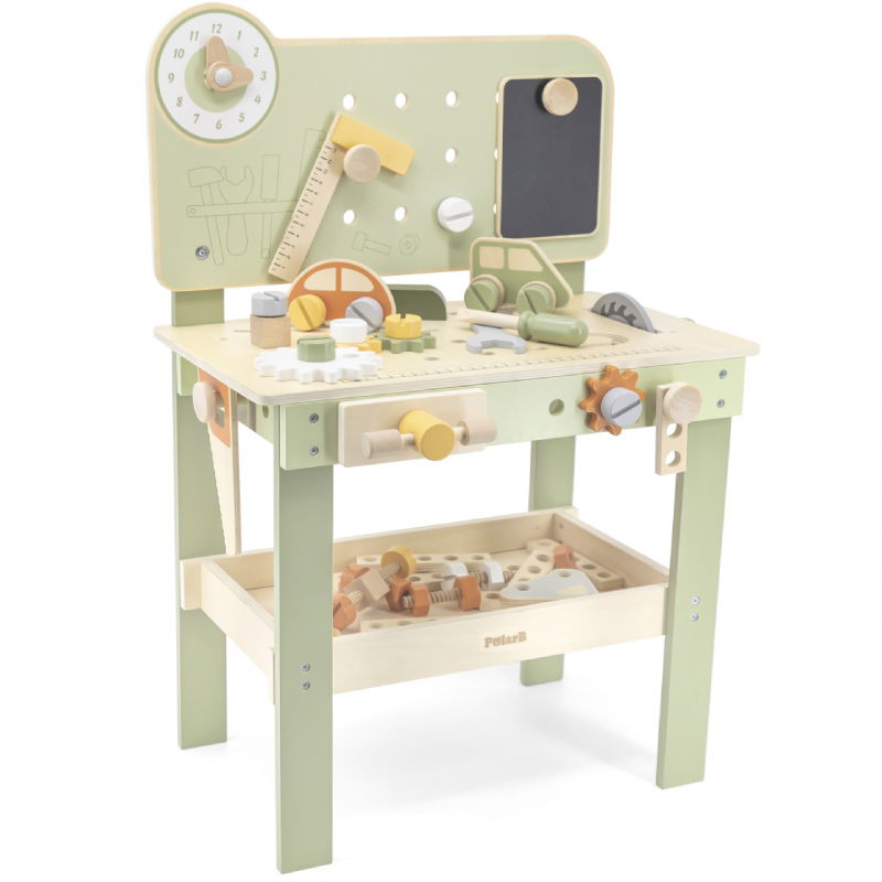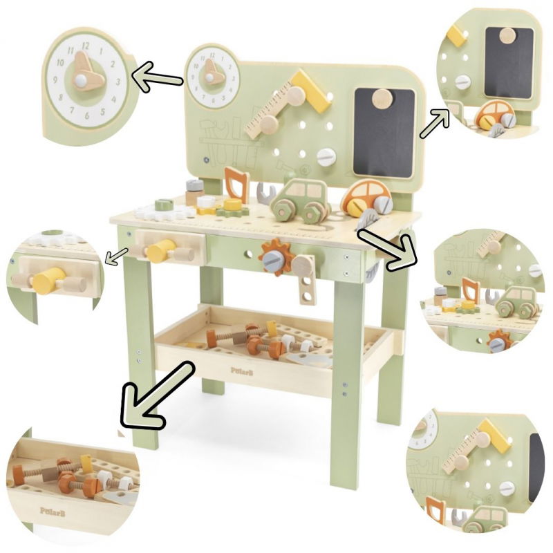 Dzięki temu warsztatowi dzieci mogą przeżyć prawdziwą przygodę jako mali mechanicy. Zabawka zawiera warsztat z narzędziami, śrubkami, rysunkami zwierząt, zegarem, drewnianymi samochodzikami i różnymi narzędziami. Dziecko ma możliwość skręcania śrubek, zmieniania kół w samochodzikach oraz "obcinania" elementów. Wszystkie narzędzia i dodatki można przechowywać na półce pod stołem. Zabawka rozwija wyobraźnię, zręczność, kreatywność, motorykę oraz koordynację ręka-oko. To idealny sposób na rozwijanie umiejętności manualnych i zachęcanie dzieci do twórczego myślenia.