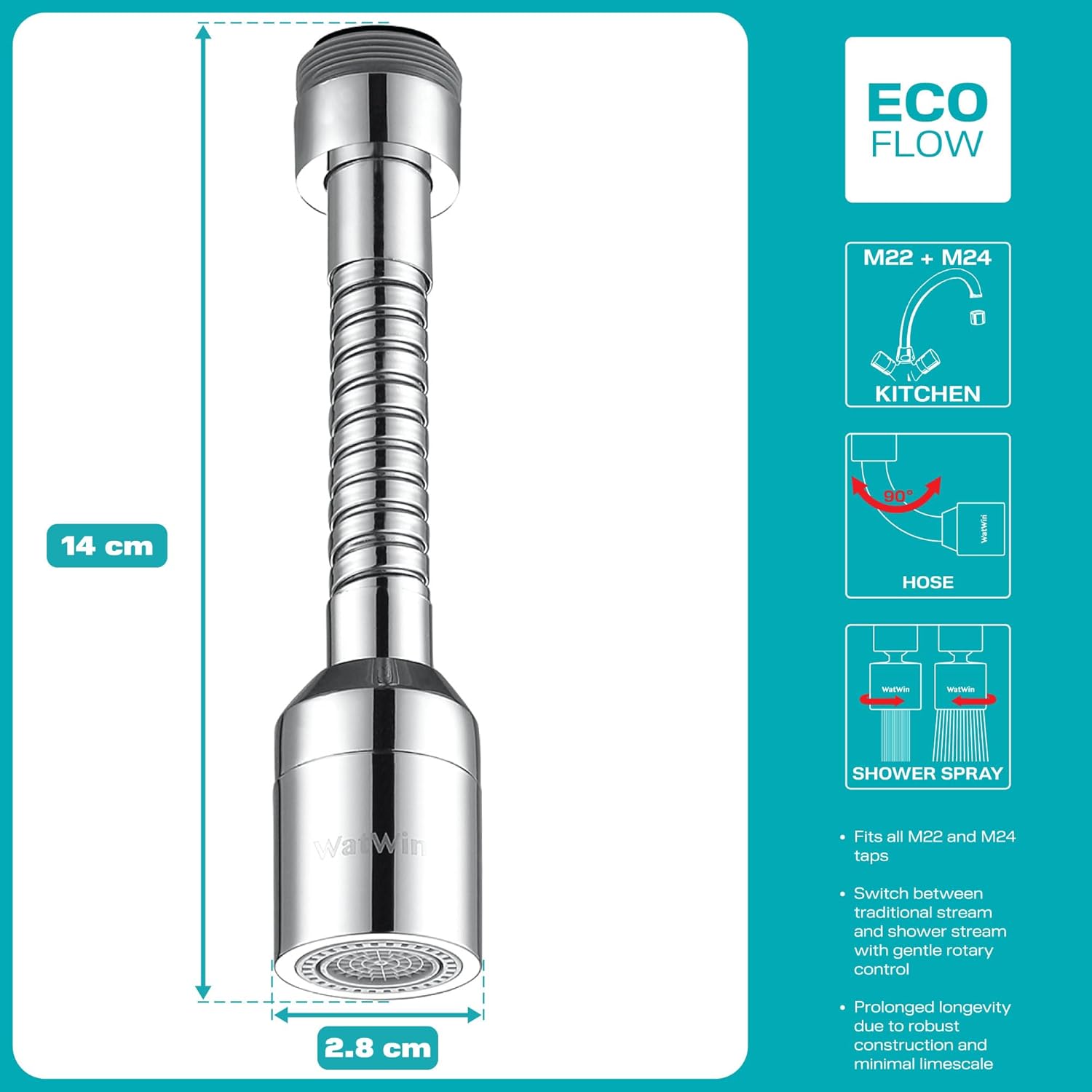 Łatwy w montażu aerator z gwintem żeńskim 22 mm (jeśli kran ma gwint męski, podłącz go bezpośrednio). W zestawie znajduje się adapter z gwintem męskim (jeśli kran ma gwint żeński, podłącz go za pomocą adaptera).Funkcja podwójnego przepływu, przełączanie między strumieniem tradycyjnym i natryskowym za pomocą delikatnego pokrętła.Oszczędność wody do 60% (w porównaniu ze standardowym aeratorem).Można go zamontować na bateriach kuchennych, bateriach zlewozmywakowych i bateriach łazienkowych.