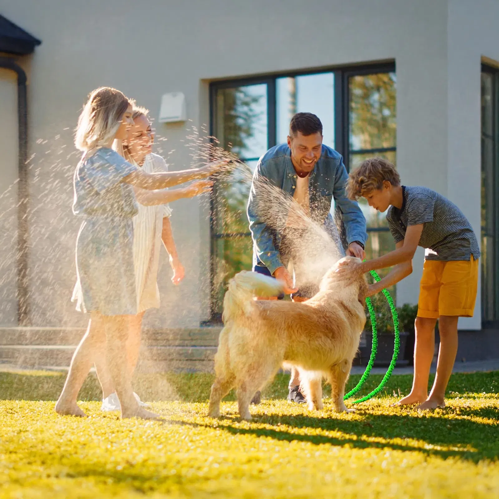 Nawadnianie trawnika – Dzięki elastyczności i regulowanej długości wąż świetnie sprawdzi się przy nawadnianiu całych trawnik.