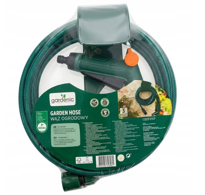 W zestawie hak do powieszenia oraz komplet akcesoriów: 2 złączki, przyłącze kranowe 3/4 cala z redukcją do 1/2 cala. Z wygodnym pistoletem z regulacją strumienia wody