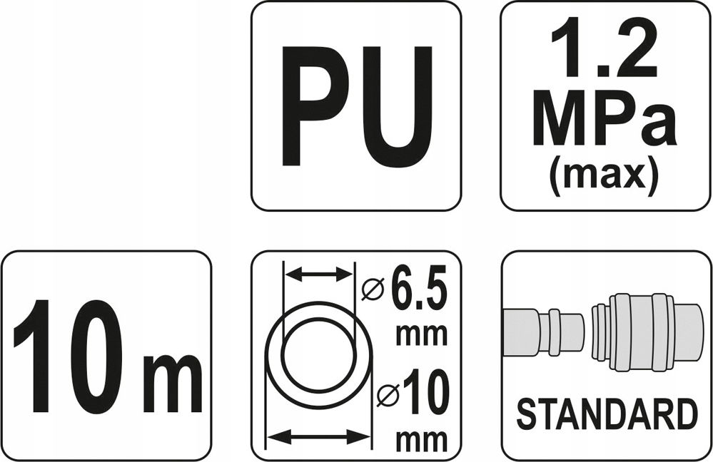 Profesjonalny spiralny wąż pneumatyczny zakończony szybkozłączami. Przewód o wymiarach 6,5x10 mm o długości 10 metrów wykonany z odpornego poliuretanu. Wąż jest odporny na niskie i wysokie temperatury, dzięki temu może znaleźć zastosowanie również poza warsztatem. Konstrukcja drobnego zwoju oszczędza miejsce, a fabrycznie instalowane szybkozłącza sprawiają, że jest to niezastąpione narzędzie w każdym warsztacie lub zakładzie produkcyjnym.