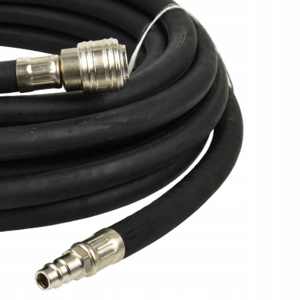 ➡️ Profesjonalny pneumatyczny przewód gumowy o długości 10 metrów. Przewód wykonano z gumy odpornej na olej oraz ścieranie. Elastyczna guma zapobiega trwałym odkształceniom. Przewód jest kompletny, okuty w standardowe szybkozłącze i wtyczkę.