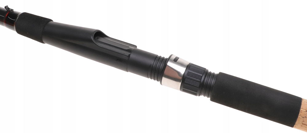 Wędka posiada rękojeść z gąbki oraz korka dla pewniejszego chwytu