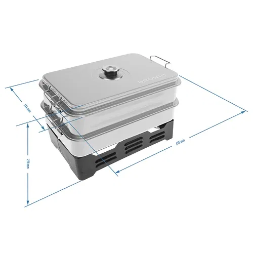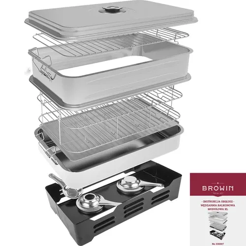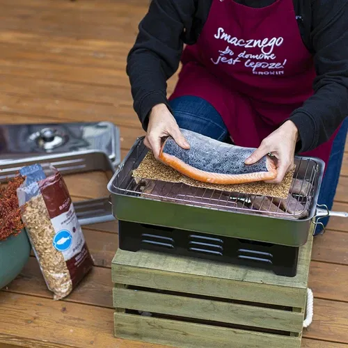 Porcja dla każdego – wędzarnia z regulacją pojemności pozwoli Ci na przygotowanie pysznych wędzonych ryb, mięs, serów i wędlin nawet na niewielkim balkonie. Jeden ruszt wystarczy na przygotowanie obiadu, specjalna nadstawka z drugim rusztem pozwoli zaś na prawdziwą świąteczną ucztę! Solidne wykonanie – wędzarnia wykonana z wysokiej jakości stali nierdzewnej przeznaczonej do kontaktu z żywnością to gwarancja wielu pysznych uczt! Tą wędzarnią z pewnością będziesz cieszyć się przez lata! Termometr w zestawie – w zestawie do wędzarni dołączony jest termometr - niezbędne akcesorium pozwalające na regulację temperatury podczas całego procesu wędzenia i idealne przygotowanie Twoich ulubionych dań! Wędzenie pod kontrolą - specjalne palniki, w których umieszcza się bezzapachowe paliwo żelowe znajdują się poza komorą wędzarniczą i posiadają regulację płomienia umożliwiającą zwiększenie lub zmniejszenie temperatury w komorze wędzarniczej. Wędzenie dla każdego - już nie musisz mieć dużego ogrodu, aby samodzielnie wędzić. Wystarczy Ci niewielki balkon lub taras. Dzięki niewielkim rozmiarom wędzarnię możesz zabrać na camping czy biwak, a dodatkowe ruszty pozwolą Ci na przygotowanie jedzenia dla naprawdę sporego grona! Wysokiej jakości przenośna wędzarnia z regulacją pojemności idealnie sprawdzi się w Twojej kuchni oraz będzie fantastycznym pomysłem na prezent! Wykonana z wysokiej jakości stali nierdzewnej, pozwala na uwędzenie mięsa, ryb, serów, jajek oraz kiełbas. Jej niewielkie rozmiary sprawiają, że możesz używać jej zarówno na balkonie, tarasie, w ogrodzie, jak i podczas podróży np. na campingu czy biwaku. Wykorzystanie jednego rusztu wędzarni pozwoli Ci na jednorazowe uwędzenie do 4 pstrągów - dodatkowe piętro z drugim rusztem sprawi zaś, że w wędzarni przygotujesz posiłki przy okazji świąt lub spotkań w większym gronie!