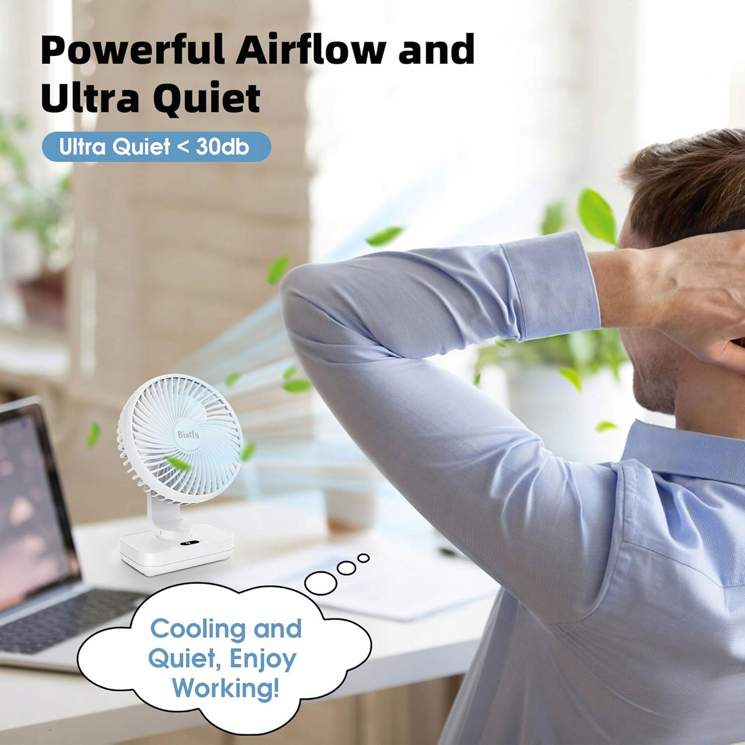 Dzięki 4 prędkościom wentylatora do wyboru, w tym trybowi cichemu, można dostosować przepływ powietrza do własnych upodobań. Wbudowany akumulator pozwala cieszyć się chłodną bryzą przez wiele godzin. Niezależnie od tego, czy pracujesz, relaksujesz się, czy śpisz, ten wentylator zapewni Ci ochronę.