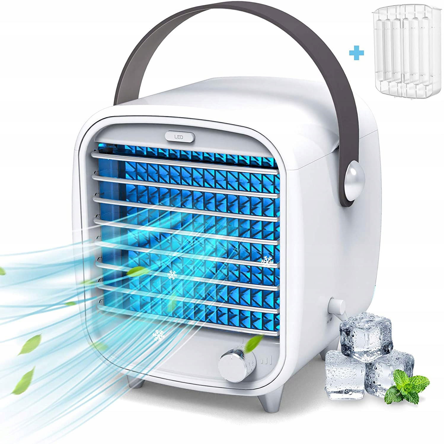 Mini chłodnica powietrza. Może być używany jako mały osobisty klimatyzator, wentylator biurkowy, nawilżacz i osobista strefa chłodzenia. Zawsze możesz dodać kostki lodu do tacki na wodę, aby uzyskać dodatkowy efekt chłodzenia.